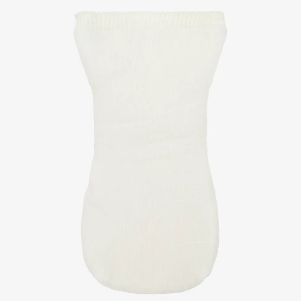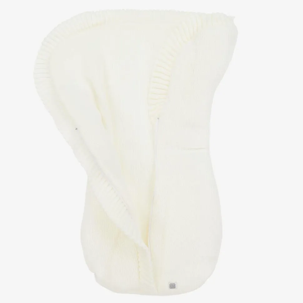 A lovely ivory knitted baby nest for boys and girls by Minutus. Beautifully soft and warmly padded, it has a knitted lining and knitted ruffle trims. There is a concealed front zip fastening, with a small branded tab at the bottom.