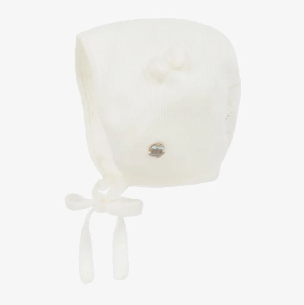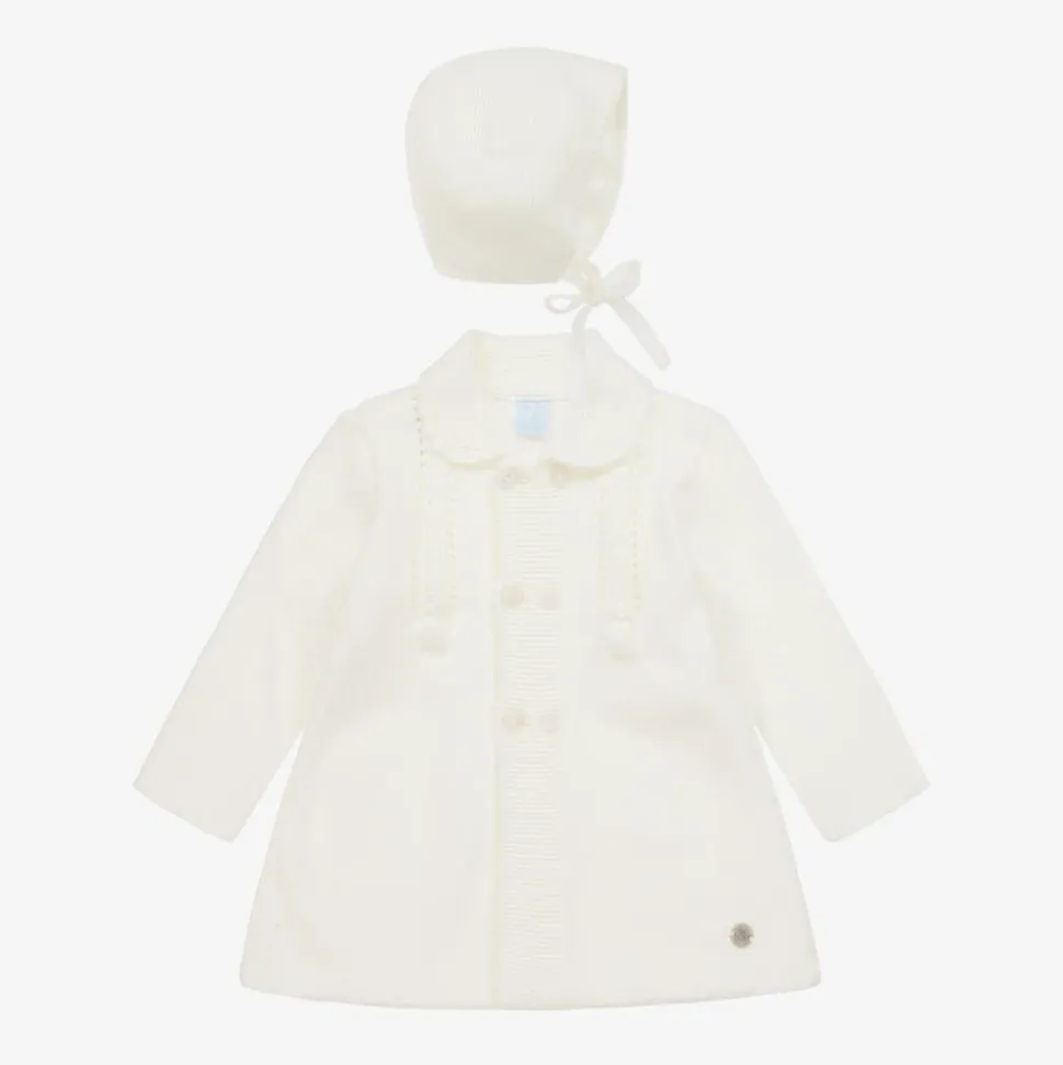 Knitted ivory coat and hat set for baby boys and girls by ArtesanĂa Granlei. The traditionally-styled coat has a rounded collar, pointelle trims and cute pom-pom decorations. It fastens with double-breasted buttons on the front a classic look, and is accessorised with an adorable, tie-fastening bonnet.