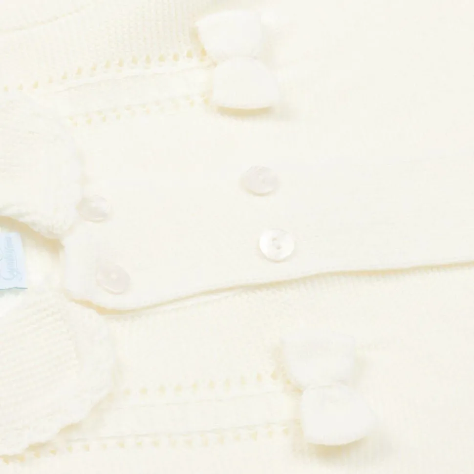 Knitted ivory pram coat and hat set for baby girls by Artesanía Granlei, great for adding a layer of cosiness when out and about. Traditionally styled, it has a rounded collar, pointelle trims and cute bows appliquéd on the chest. It fastens with double-breasted buttons on the front a classic look, and is accessorised with a frilly tie-fastening bonnet.