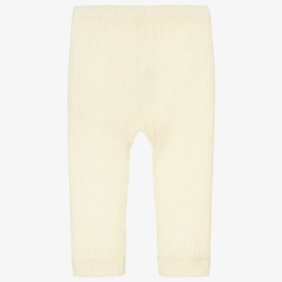 A pair of ivory thermal leggings for little boys and girls by Joha, made in a beautifully soft, ribbed Merino wool. Cosy and warm, they are ideal as an extra layer when the weather turns colder, or they can be worn as comfortable leggings. The waistband is gently elasticated for comfort and there is a striped logo tab stitched on one side seam.