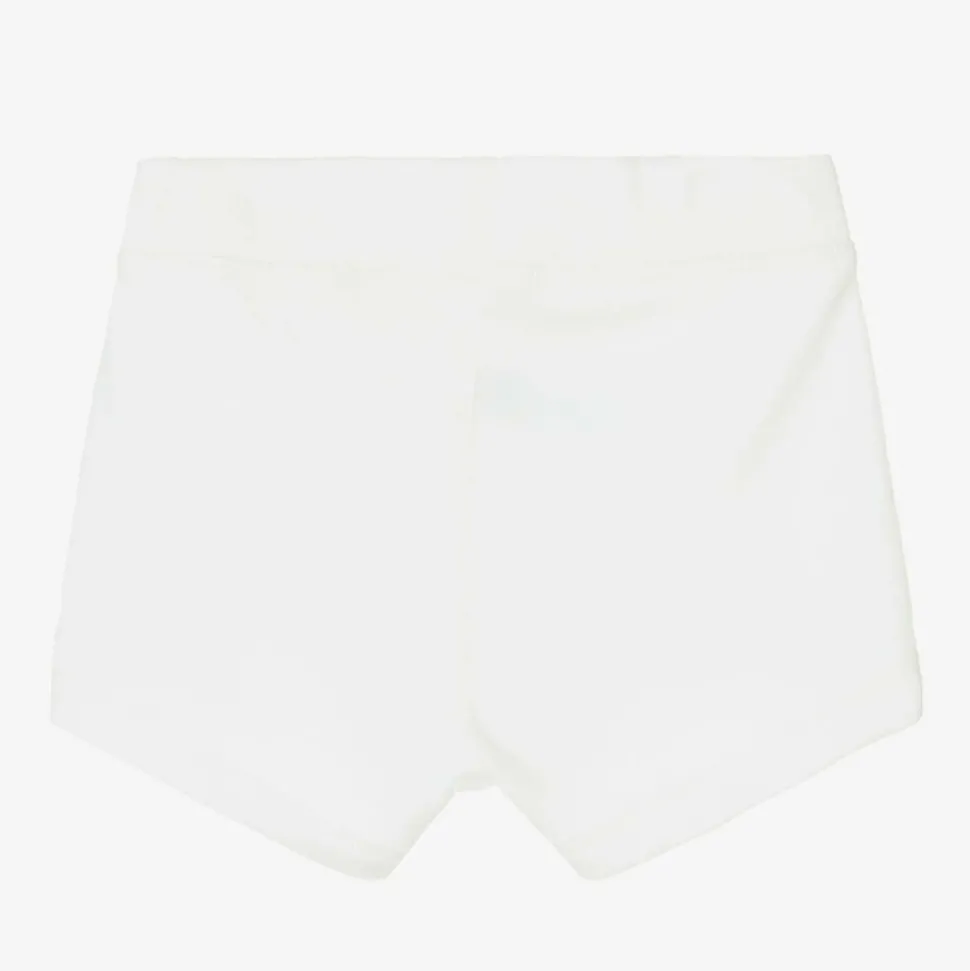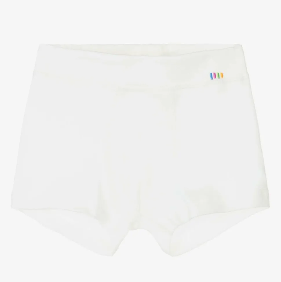Ivory boxer shorts for boys, by Joha. Made in a luxuriously soft wool and organic cotton blend, these jersey boxers have a comfortable stretchy waist, and a cute rainbow striped logo tab. The outside has a brushed effect and the inside is ribbed, ensuring a warm and comfortable fit.