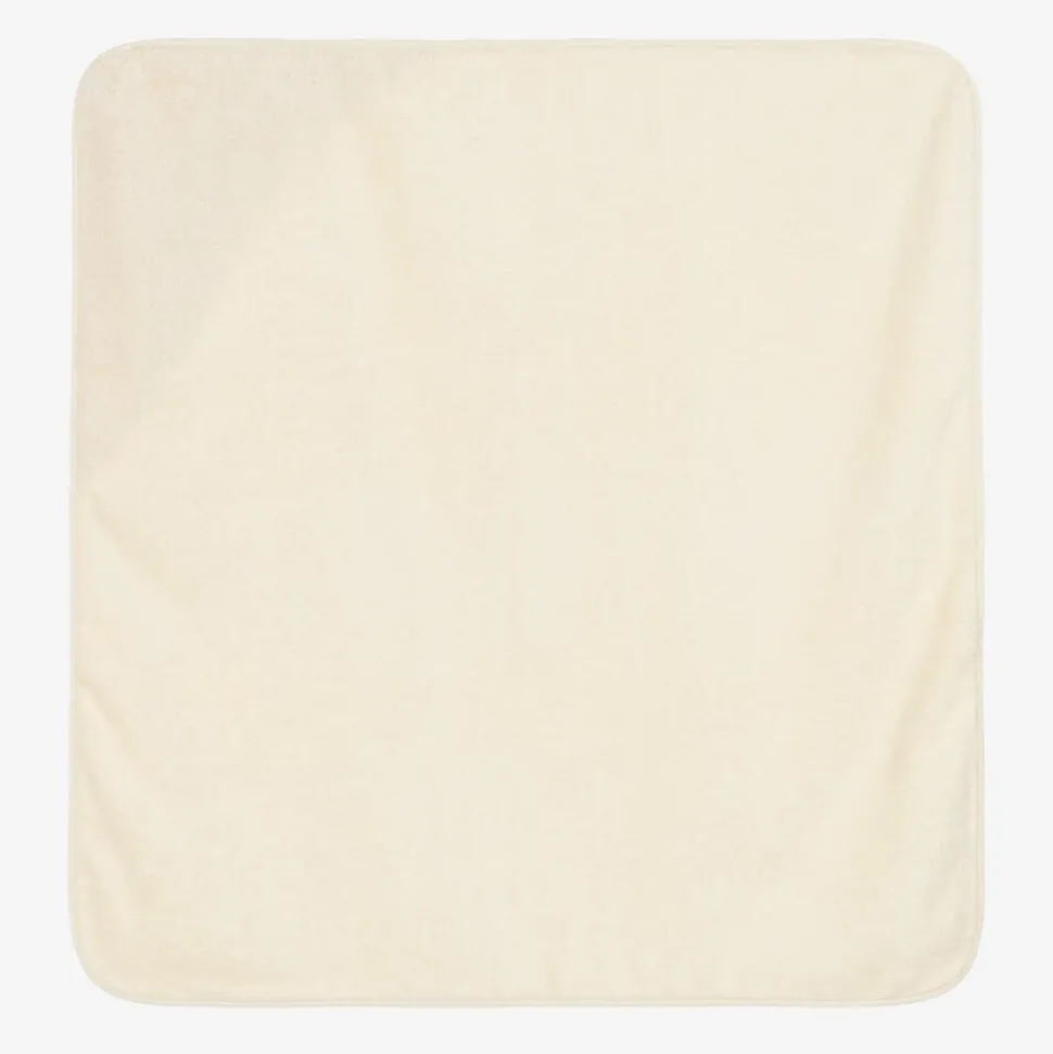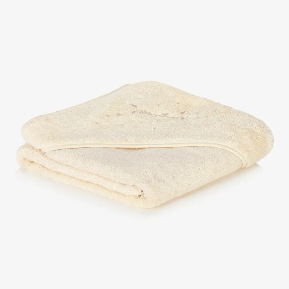 Ivory hooded towel for baby boys and girls by Naturapura, embroidered with an adorable lamb design. Made from super soft organic cotton towelling, this towel is lovely to wrap up your little one after bath time.
