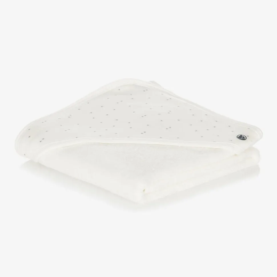 A sweet ivory hooded towel for baby boys and girls from French brand Petit Bateau. Made in soft and absorbent organic cotton blend towelling, it is comfortable against delicate skin and lovely for keeping your little one dry and cosy after bath time. The sides and hood are trimmed in soft cotton jersey with a tiny grey star pattern and a logo on the hood.