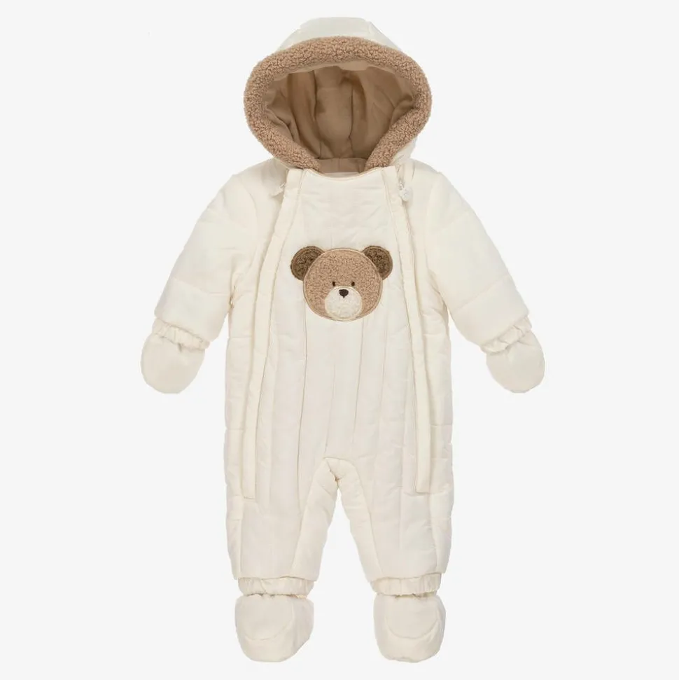 Adorable ivory quilted snowsuit for baby boys and girls from Spanish brand, Mayoral. Silky smooth and warmly padded, it has a soft and comfortable cotton jersey lining and a useful double front zip fastening. For added protection, the neck opening secures with a popper, the cuffs are elasticated and smaller sizes come with detachable mittens and booties. To complete the cute look, there is an appliqué teddy bear face on the front in soft beige teddy fleece, with matching trim on the hood.
