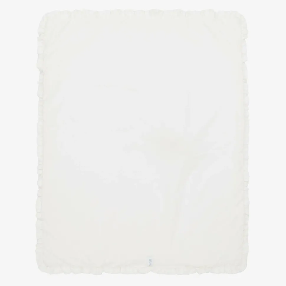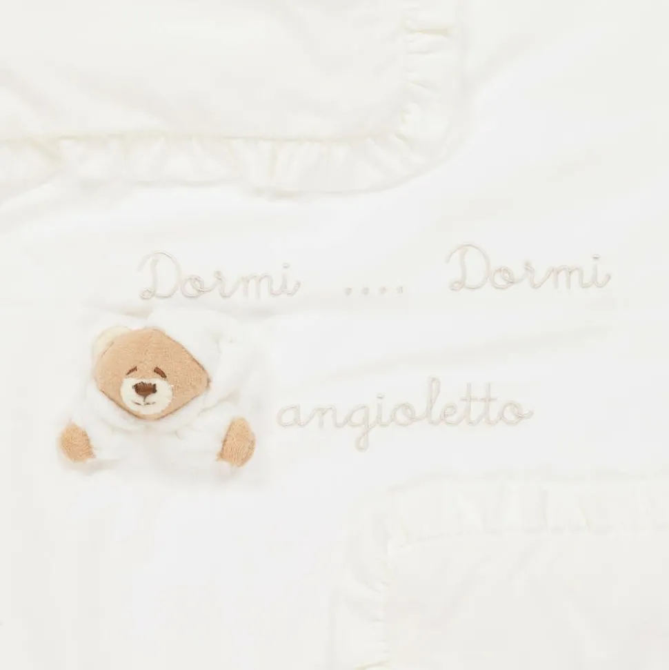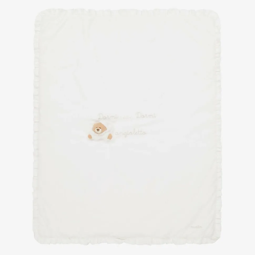 A lovely ivory blanket for baby boys and girls by Nanán, made in soft cotton jersey with light padding. Ideal for the cot or pram, this cute accessory has a decorative ruffled trim around the edge and a sweet teddy bear appliqué on the front. The tonal embroidery reads 'Sleep… sleep little angel' in Italian, along with the brand's name seen in one corner. It comes with a buttoned fabric bag for easy storage.
