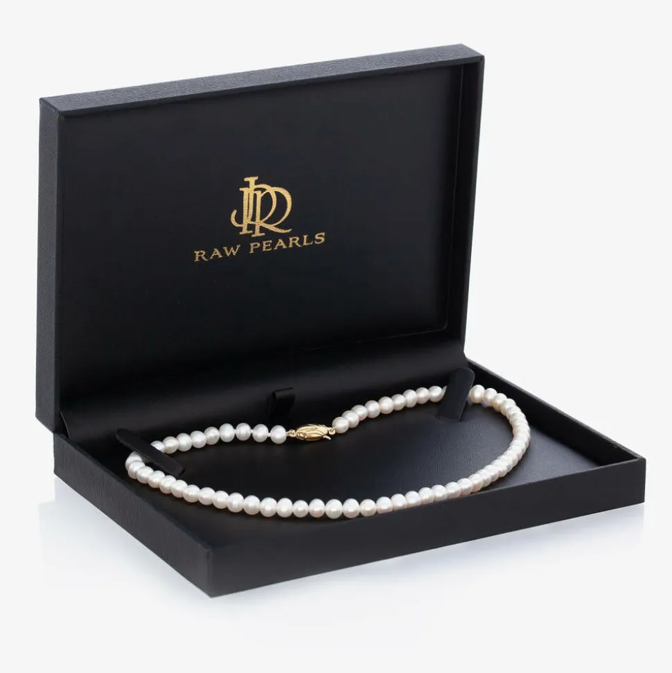 Beautiful ivory freshwater pearl necklace for girls by Raw Pearls. This lovely design is made with cultured river pearls for timeless elegance. It fastens with a luxurious gold-plated silver clasp in the shape of an oyster shell. Included is an extra 10cm of pearls to be attached as your little girl grows.