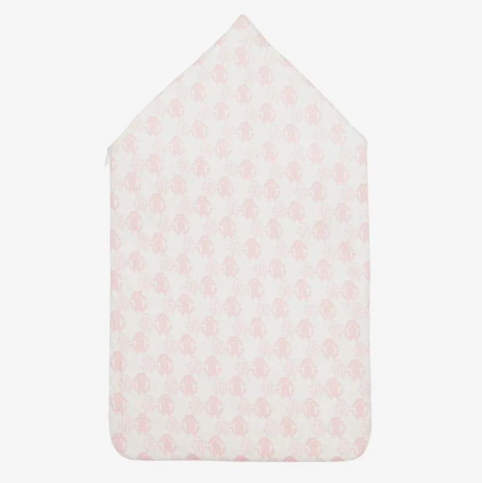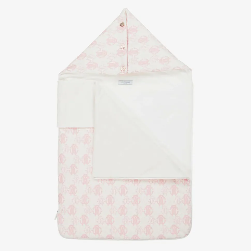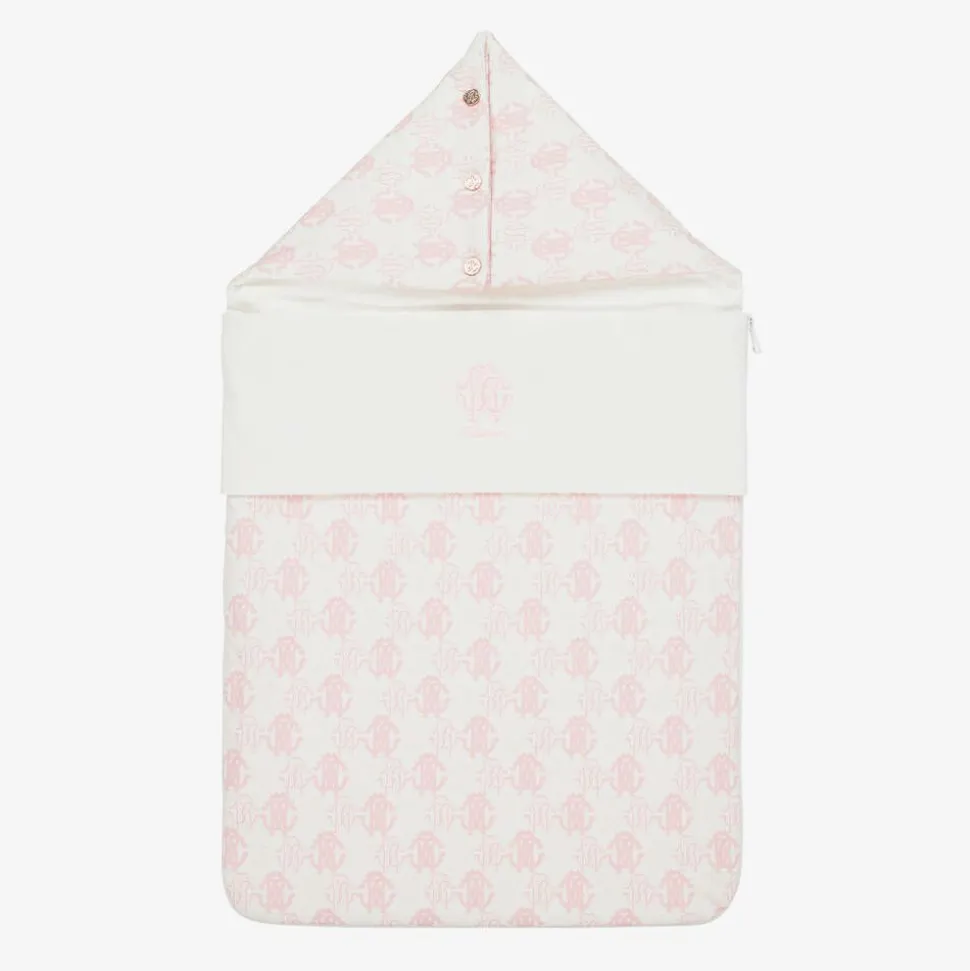 In ivory and pale pink, this lovely nest for baby girls is by luxury brand Roberto Cavalli. Made in the softest cotton jersey, it is patterned with the Italian designer's signature RC Monogram, with pink logo embroidery on the front and shiny gold branded poppers on the hood. Lightly padded for warmth, it secures with a zip along one side and across the base, which can be unfastened to provide a comfortable surface for baby to play on.