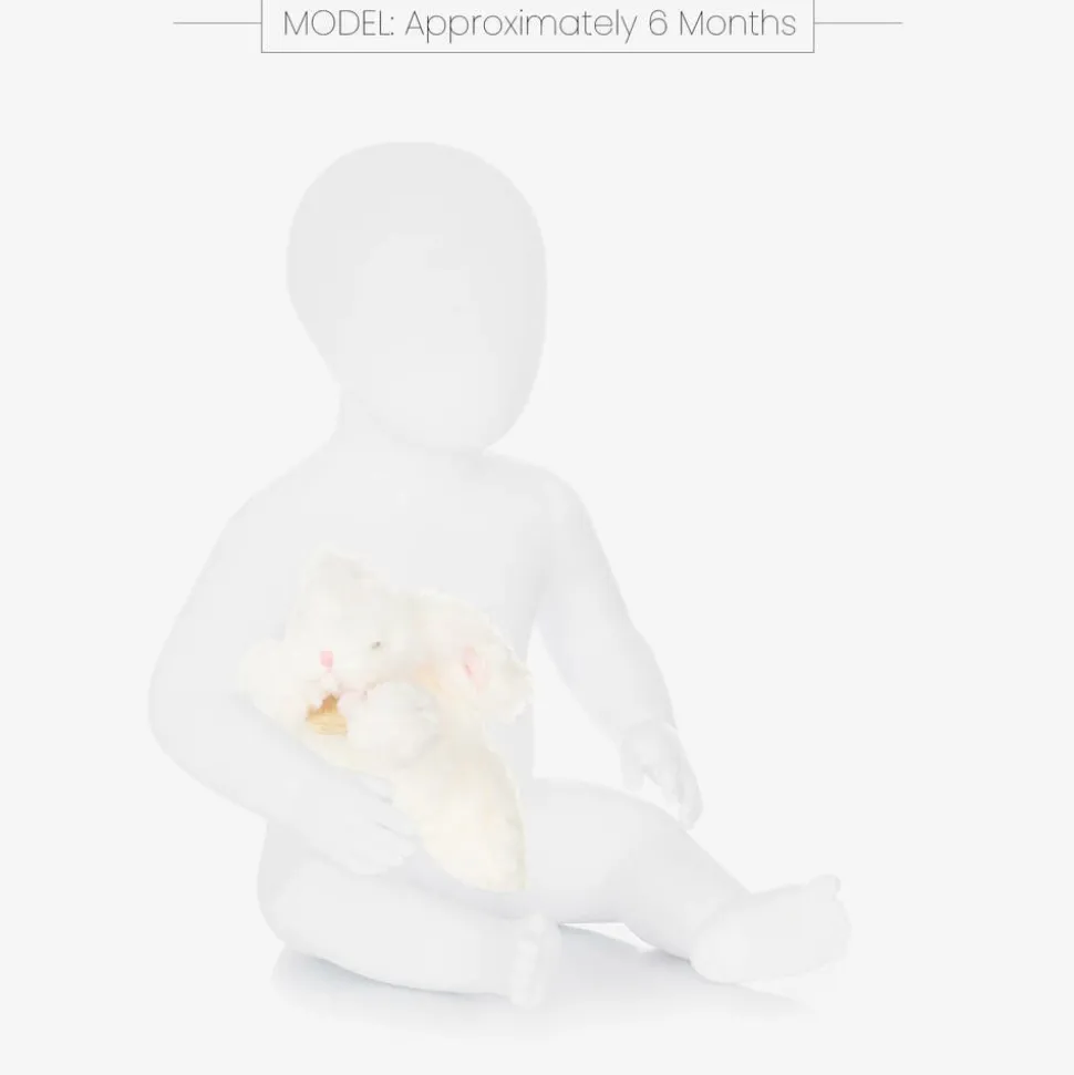 Ivory bunny toy for baby girls by Doudou et Compagnie. Made in soft plush, it has a sweet embroidered face and little pink ears. Just below rabbit's head is a pink knotted velour trim for little hands to grasp. Presented in a pink box, it would make a lovely gift for new parents.