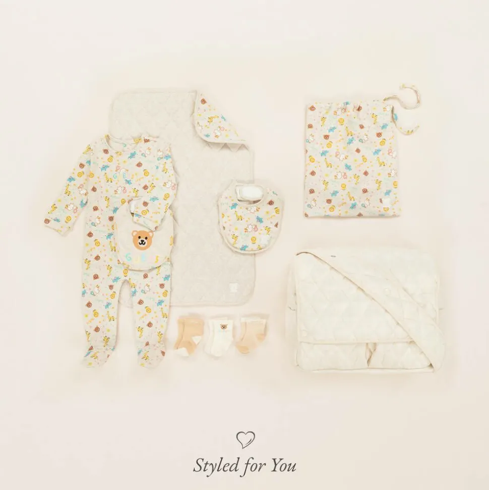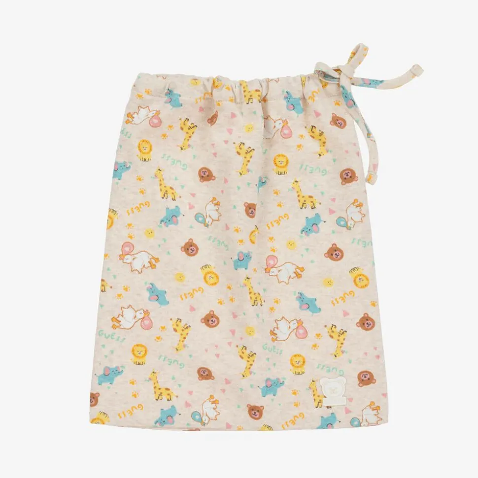 Ivory changing bag by Guess, made in soft quilted fabric. Ideal for storing all of baby's essentials, the spacious compartment fastens securely with a zip. There are useful external pockets concealed beneath a popper fastening flap and handy side pockets. The brand's logo appliqué can be seen on the front and it has an adjustable shoulder strap for comfortable wear. It comes with a lightly padded changing mat and drawstring bag, both of which are patterned with colourful logos and cute baby animals.