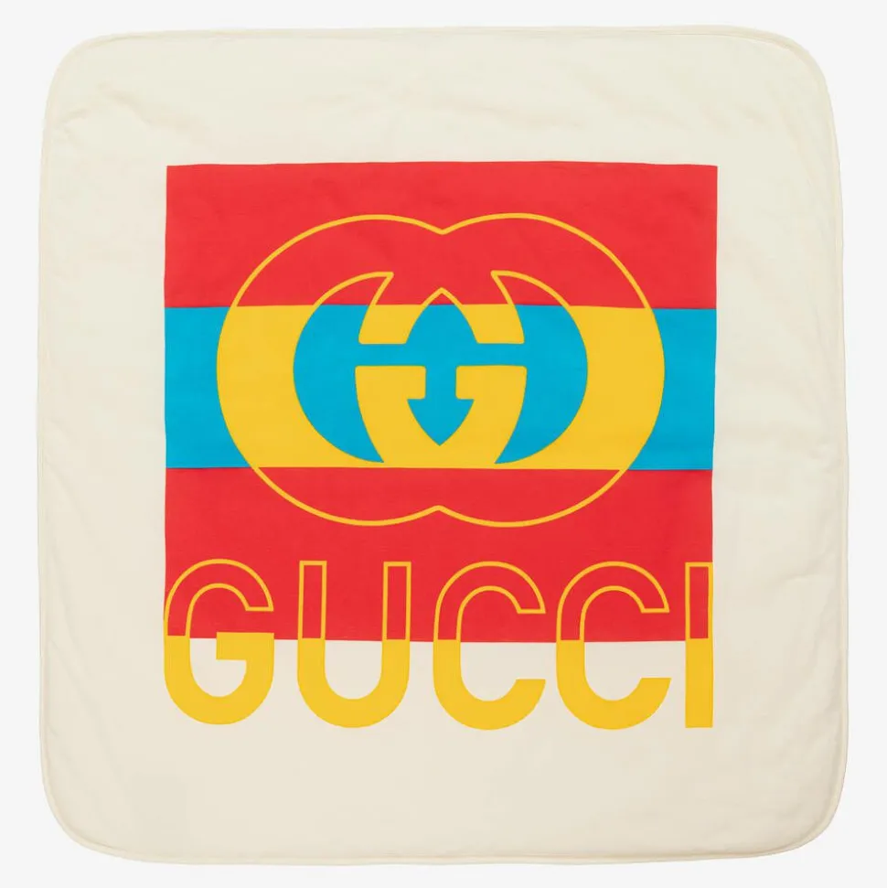 Distinctive Gucci style for baby boys and girls, this ivory padded blanket has a bold red, blue and yellow Web design on the front, featuring the Interlocking G logo print. Made in beautifully soft and comfortable cotton jersey, it has a luxurious wool blend padding for added warmth. It makes an ideal nursery accessory or a comfortable surface for baby to lie on.
