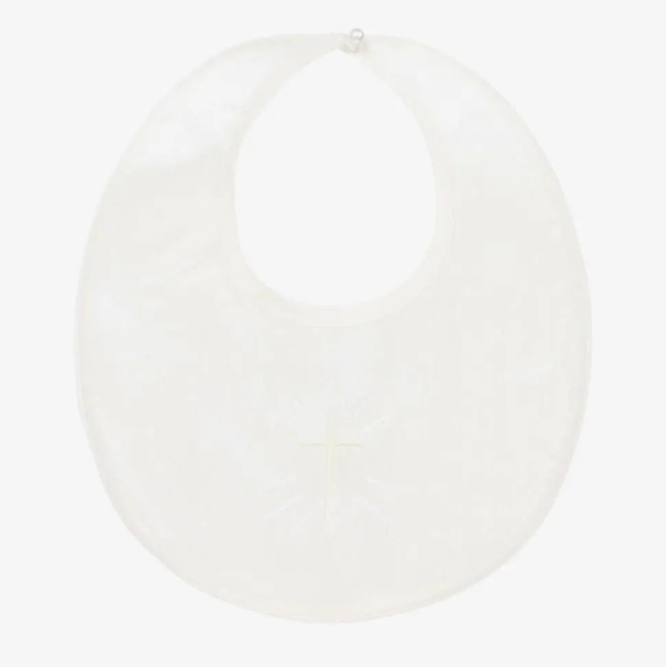 Sarah Louise ivory silk bib for baby boys and girls, with a delicate embroidery and a pearl button to fasten.