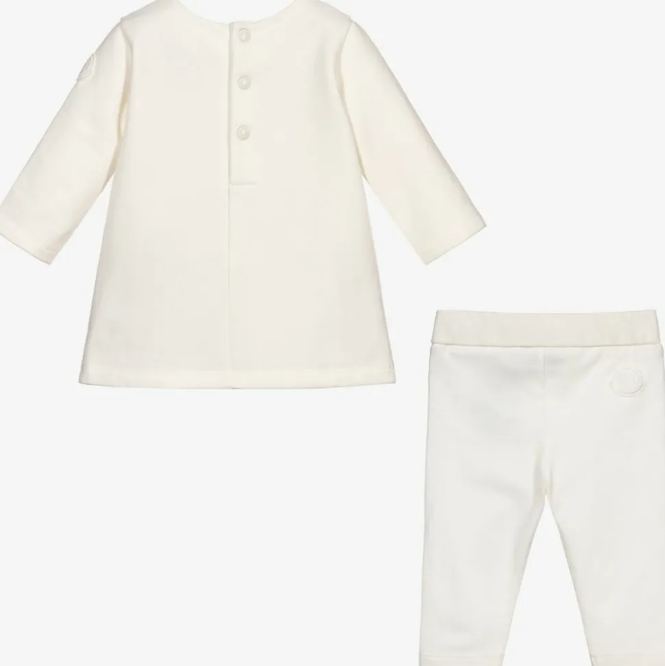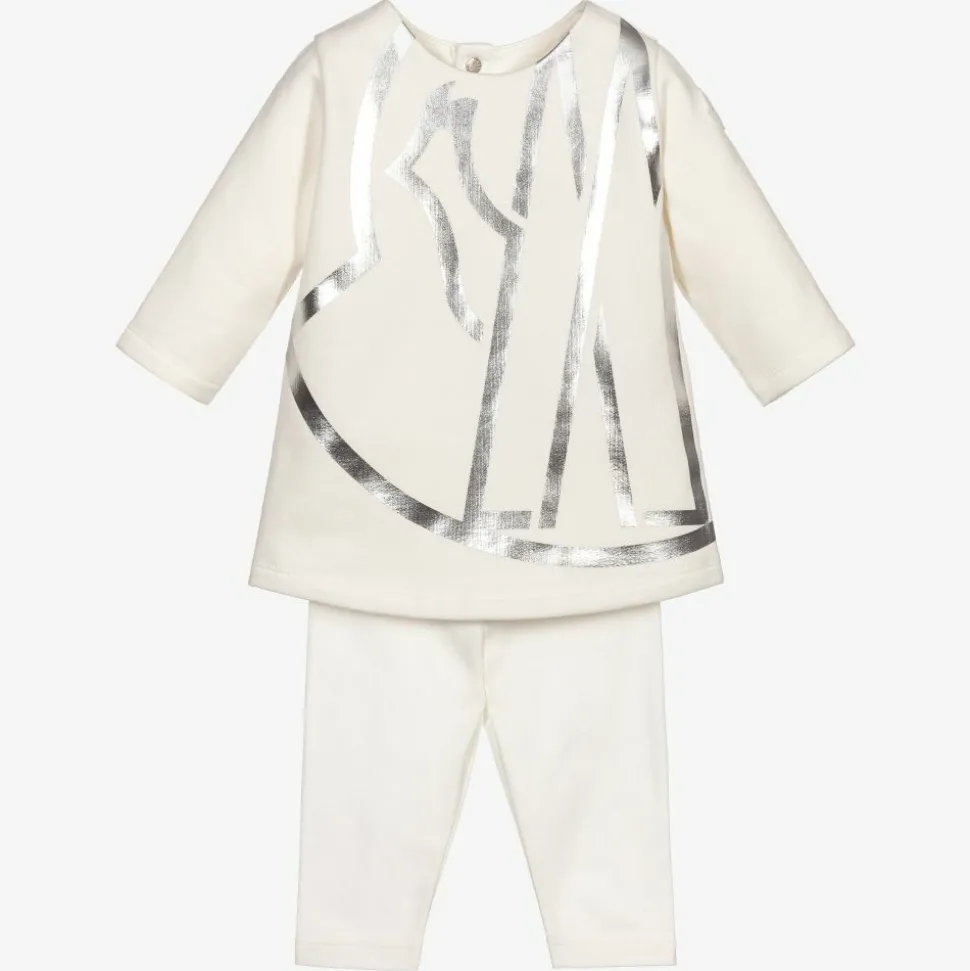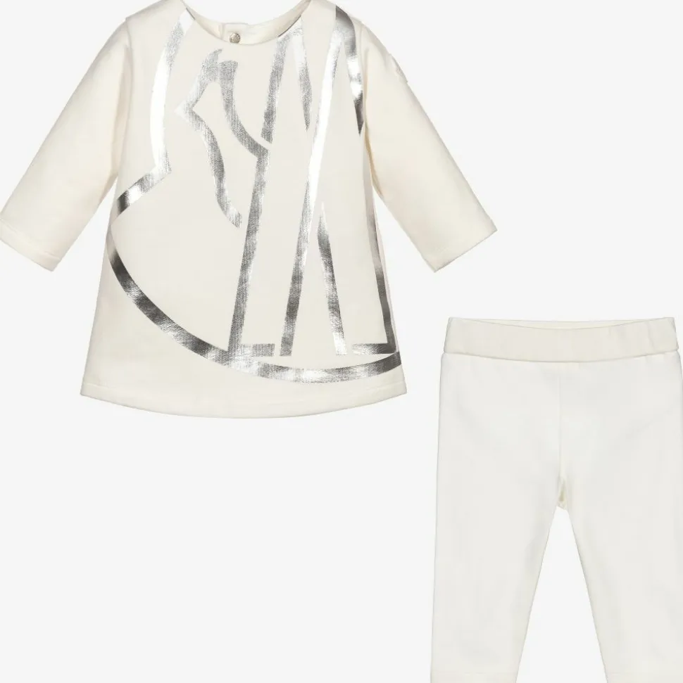 Ivory cotton jersey tunic top and leggings set for little girls by Moncler Enfant. The top has a stylish silver logo print across the front, and popper fastenings on the back, with a brushed fleece inside. The matching leggings are soft and stretchy, with an elasticated waistband.