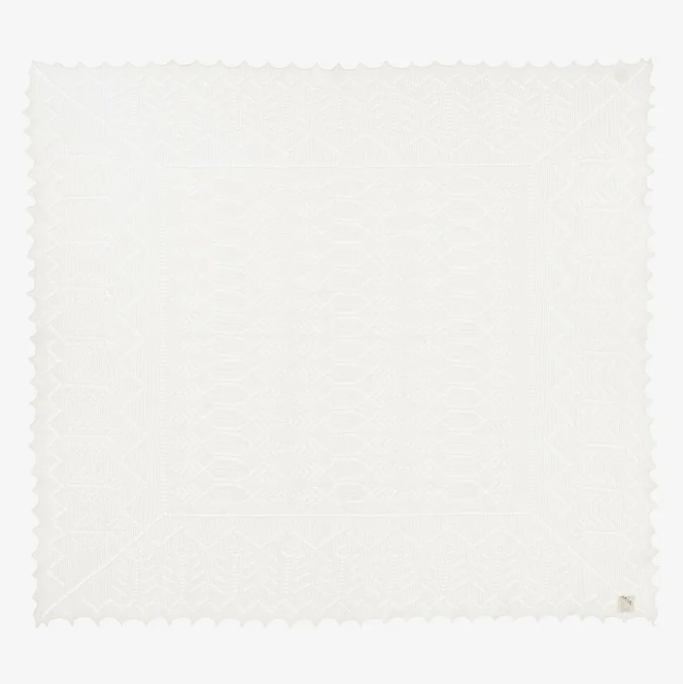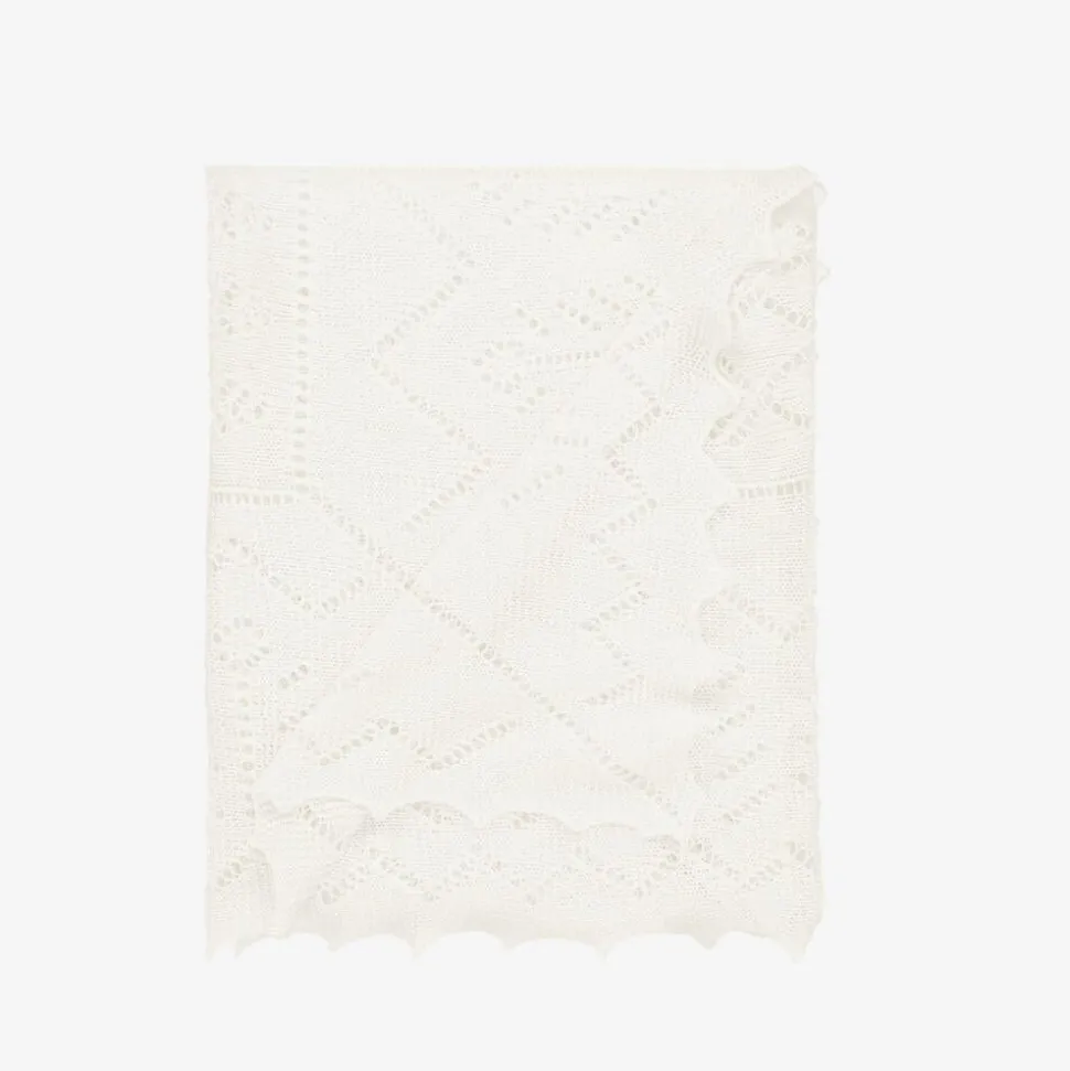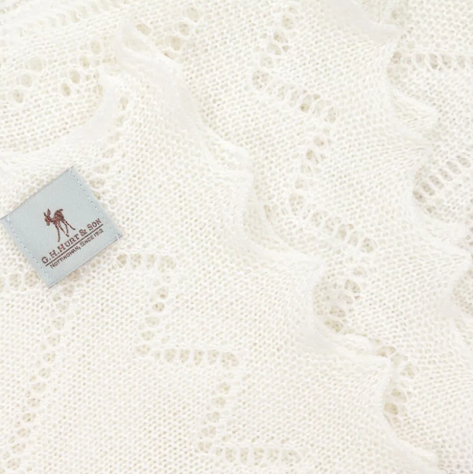 A gorgeous ivory shawl for baby boys and girls by G.H.Hurt & Son. Handcrafted by artisans using traditional techniques, it is knitted in a soft merino wool with a beautiful forest fern lace pattern design. Ideal for special occasions and ceremonies, this cosy shawl is elegantly hand finished with a scalloped edge and is presented in a charming gift box.