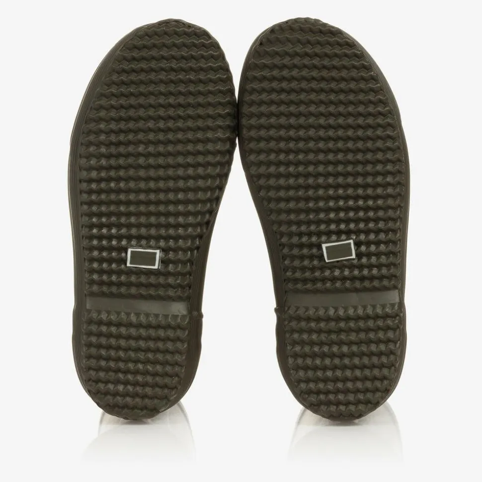 Khaki green rain boots for boys and girls by Danish brand CeLaVi, made from natural rubber. They are fabric lined and have a uniquely developed sole, so are comfortable to wear and support growing feet. There are reflective trims on the heel and side for added safety.