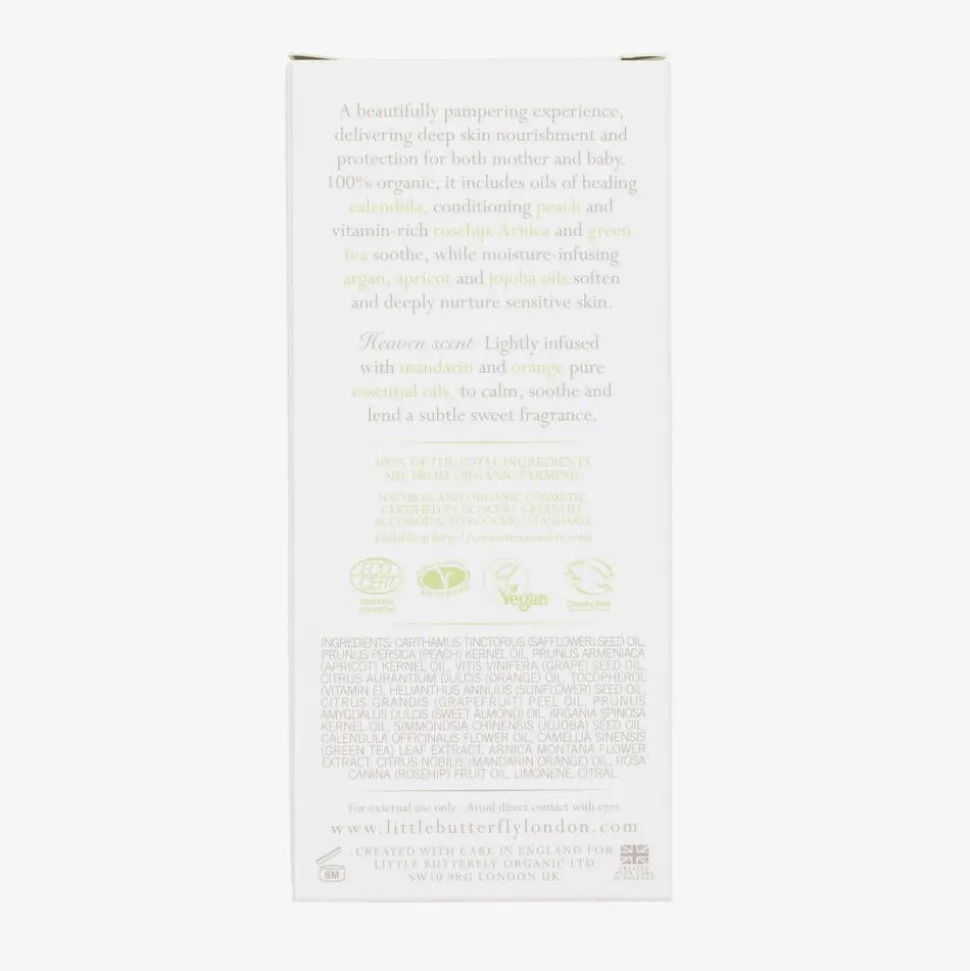 'Fall into Dreams' mother and baby massage oil by Little Butterfly London. Made from 100% organic ingredients, it contains healing calendula, conditioning peach and vitamin-rich rosehip to soothe and protect mother and baby's skin. Mandarin and orange pure essential oils help to calm the skin and leave it delicately scented. This nourishing oil can be smoothed onto babies' skin to help promote sleep, and used by mummies to help promote elasticity.