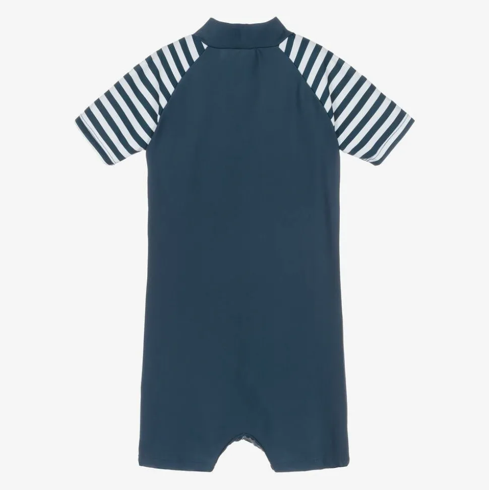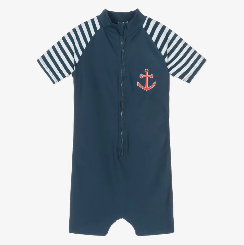 Little boys and girls navy blue all-in-one sun suit by Playshoes, with stripy sleeves and an anchor motif. With UPF 50+, this silky and stretchy one-piece fastens with a zip on the front for easy dressing, and is great to wear by the pool or on the beach.