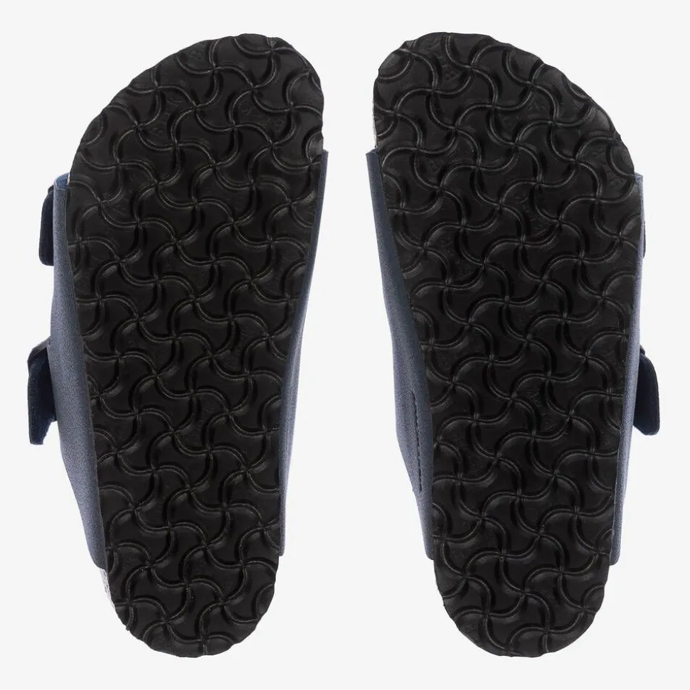 Navy blue sandals for boys and girls by Birkenstock. The Birko-Flor faux leather straps are soft yet hard-wearing, and have black metal buckle fastening straps. The uniquely contoured natural cork footbed promotes good walking posture, making them a great choice for growing feet. They have a rubberised, non-slip outer sole to improve grip.