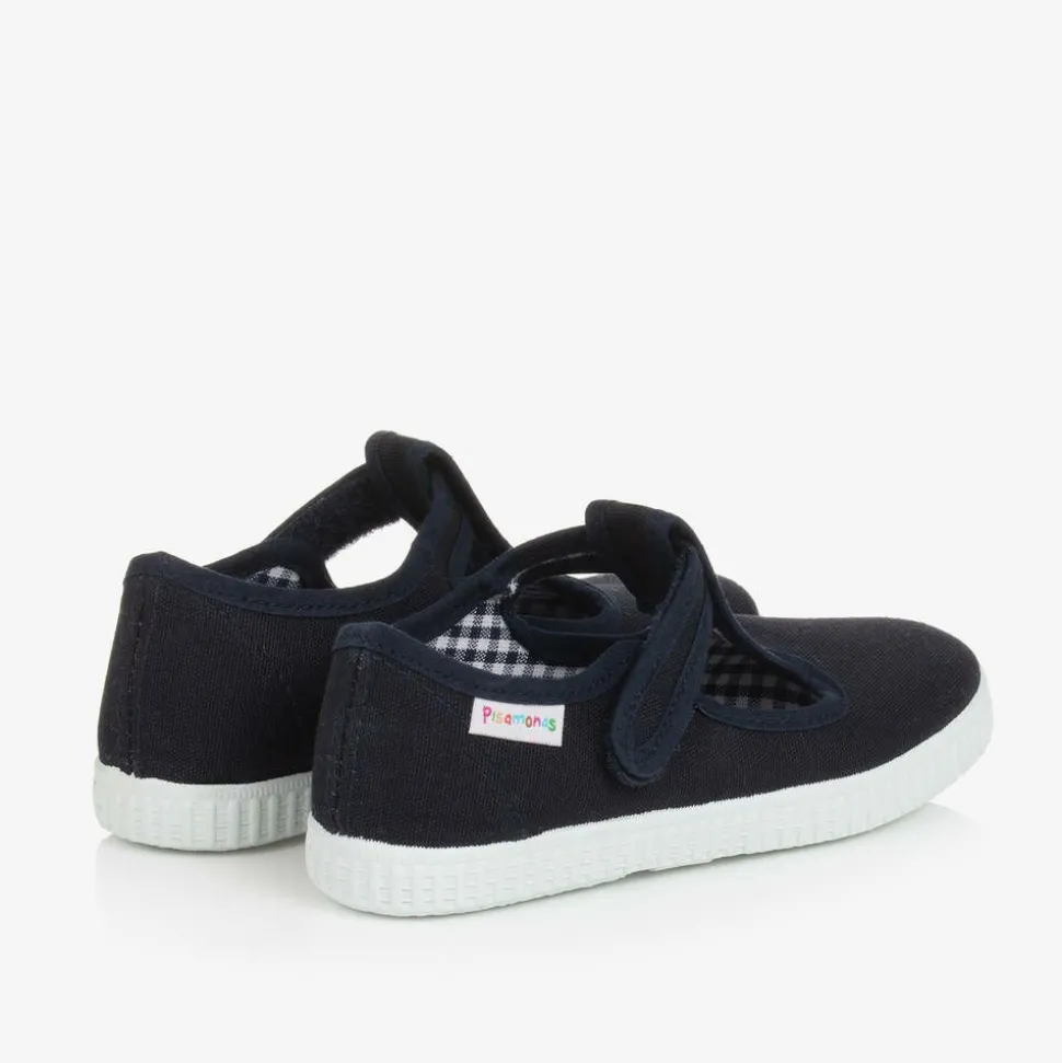 Navy blue T-bar shoes for little boys and girls by Pisamonas. Lined in soft gingham print canvas, these casual shoes have a rubberised outer sole for improved grip, and fasten simply with a velcro strap across the foot. The designer's colourful logo is stitched on the side of one foot, completing the style with subtle branding.