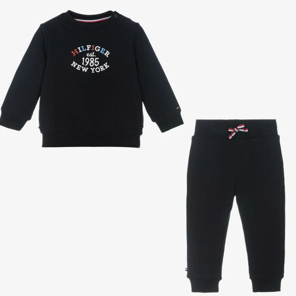 Navy blue cotton tracksuit for baby boys and girls by Tommy Hilfiger, made in soft jersey for comfortable wear. Casually styled with stretchy ribbed trims, the sweatshirt has a varsity-inspired logo design on the front and poppers on one shoulder to help with dressing. The joggers have side seam pockets, a back patch pocket and signature striped drawstring ties on the elasticated waistband. To complete the designer look, both pieces feature iconic flag embroidery. This product is made with at least 95% organic cotton.