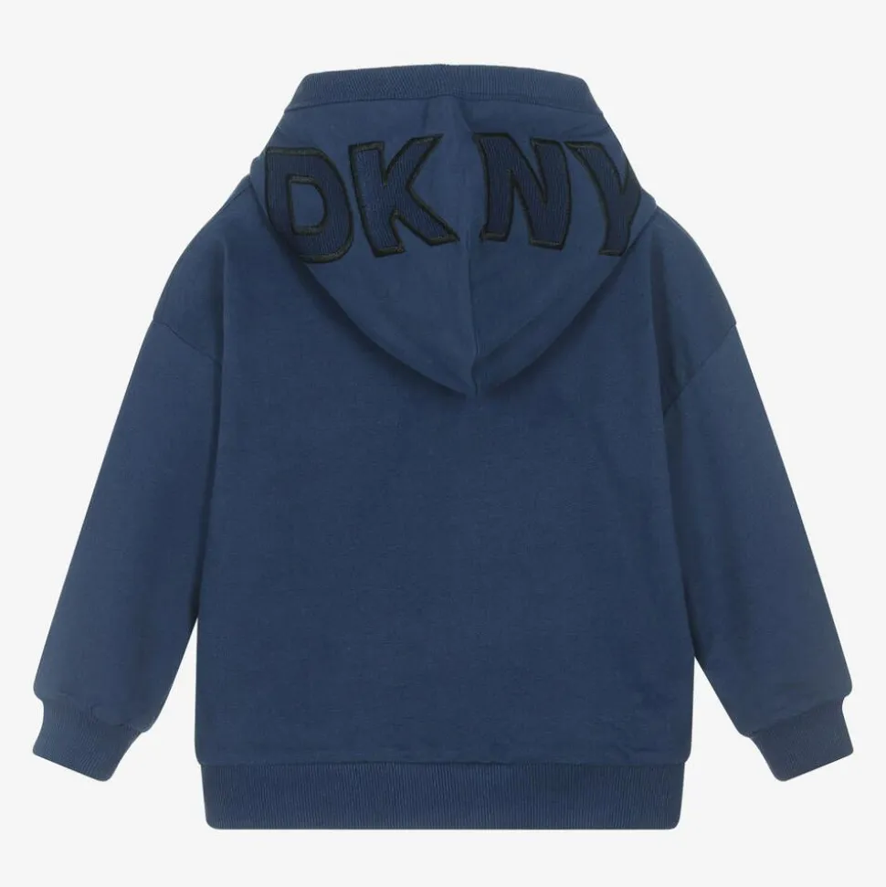 Cool navy blue hoodie for boys and girls by DKNY. Made in mid-weight cotton jersey with a super soft brushed feel and cosy ribbed trims, it is designed in a relaxed fit with dropped shoulders. The hood has a black waffle-textured jersey lining and a bold embroidered logo. Completing the look with a distinctive designer touch, there is an embroidered logo patch on the chest.