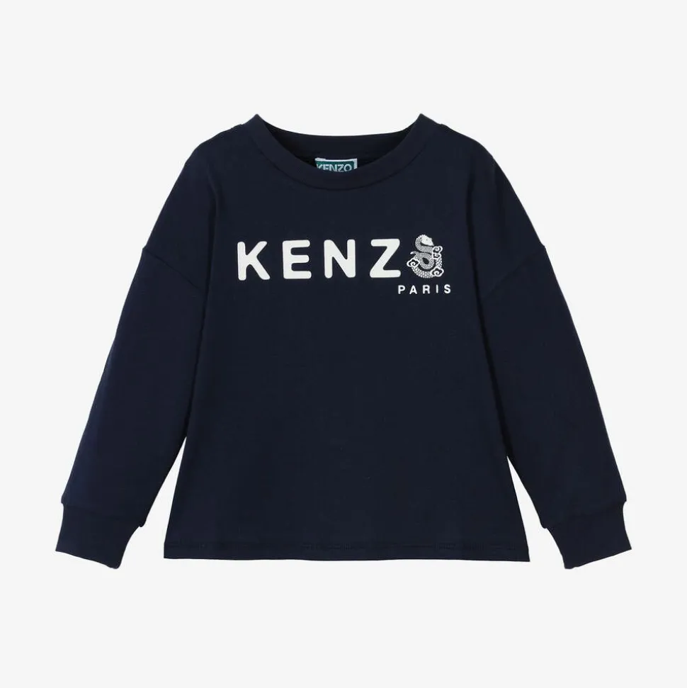 Navy blue top for boys and girls by luxury brand KENZO KIDS. Printed with white Chinese-inspired snakes and logos, it is part of the designer's Lunar New Year capsule collection. Made in comfortable jersey, it has a relaxed, drop-shouldered fit.
