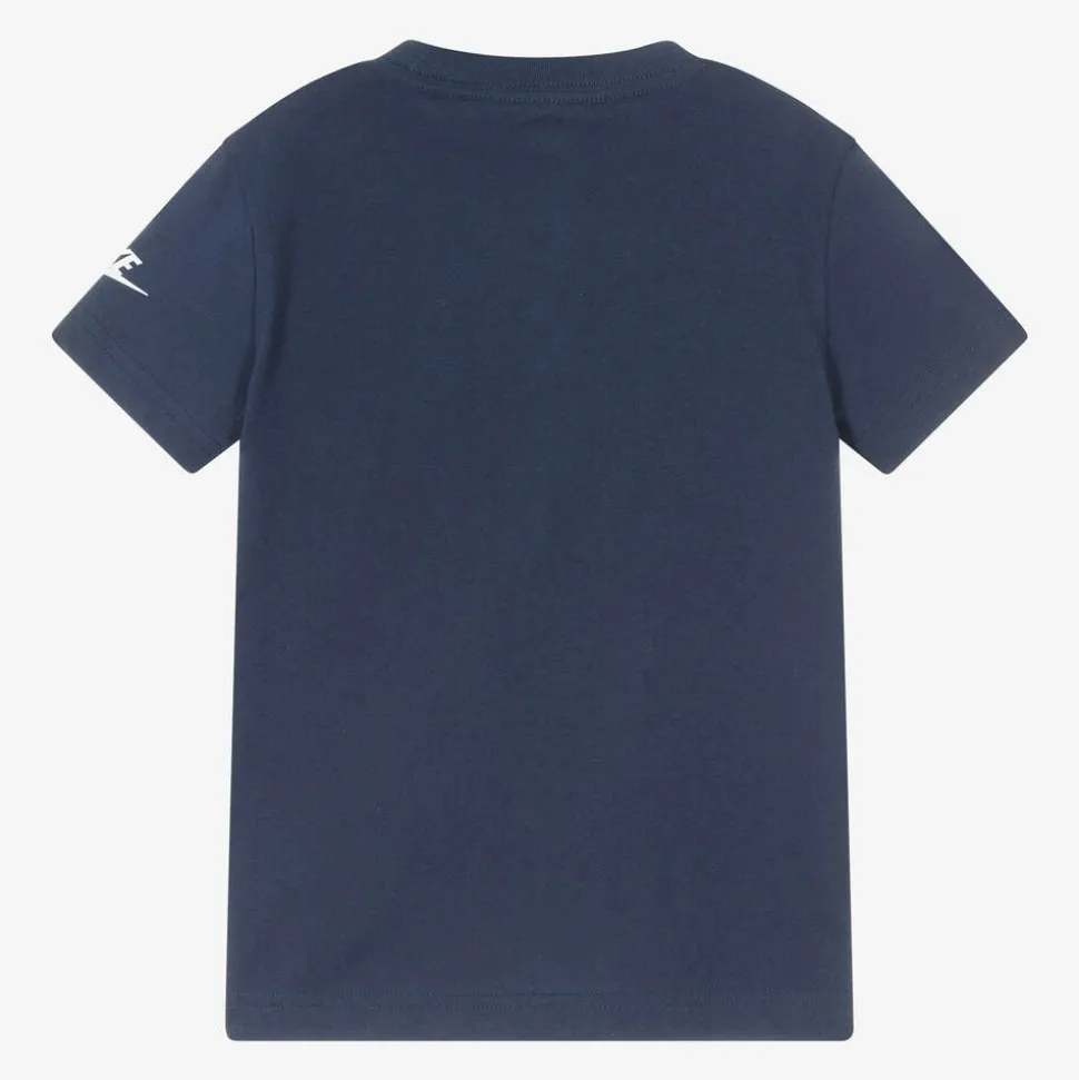 Navy blue T-shirt for boys and girls by Nike, made from a soft and lightweight cotton blend jersey for added comfort. Printed with a large white logo on the front and sleeve for instant brand recognition, this casual top has short sleeves and a crew neckline.