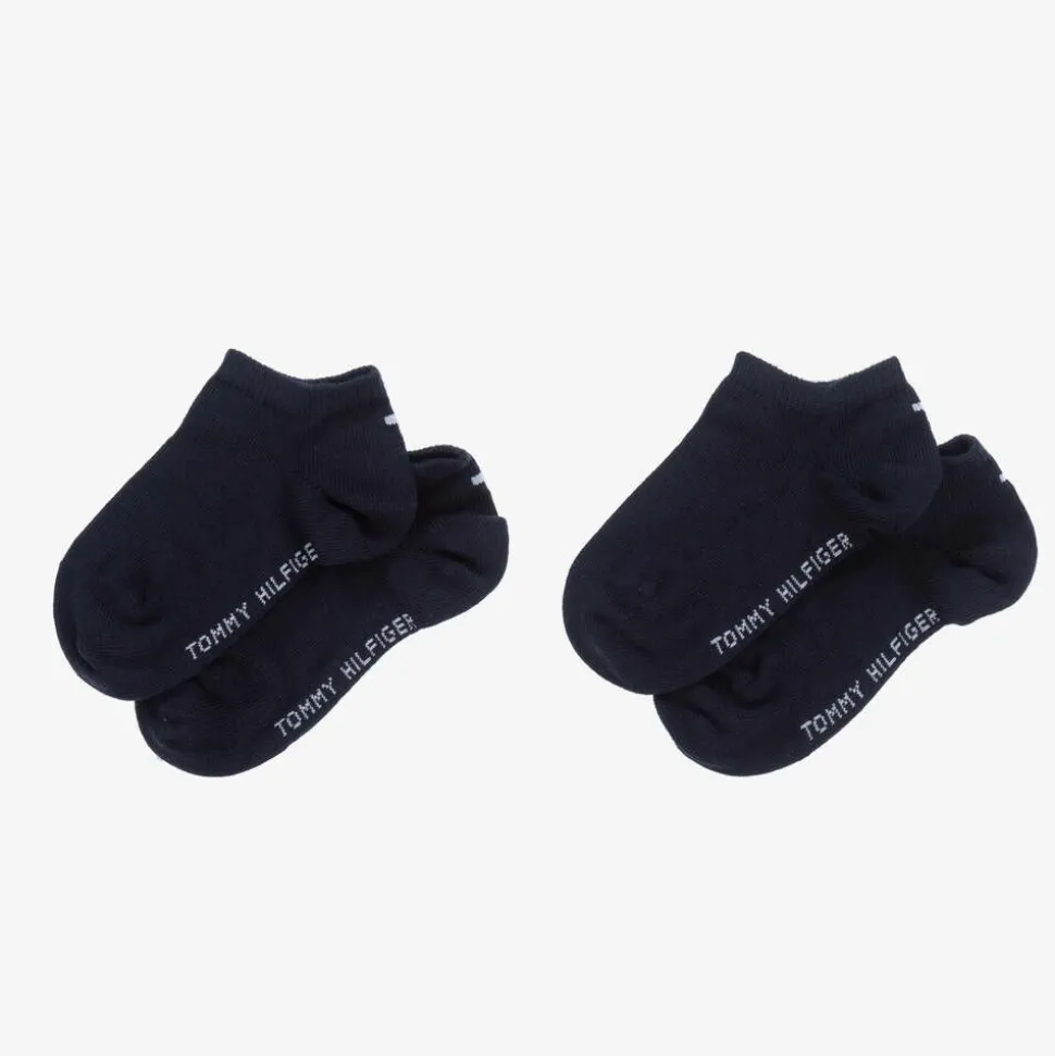 A pack of two navy blue cotton trainer socks for boys and girls by Tommy Hilfiger. Soft and stretchy for everyday wear, these socks have a signature flag logo on the heel.