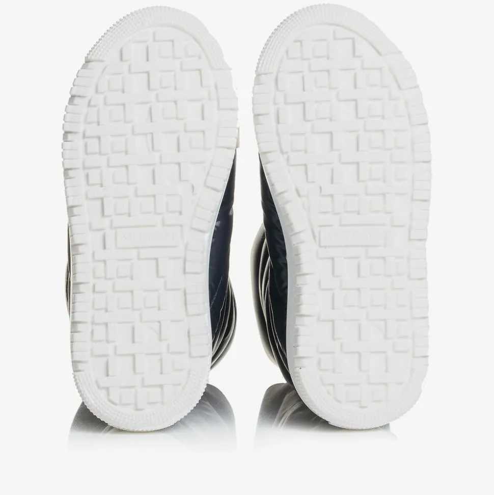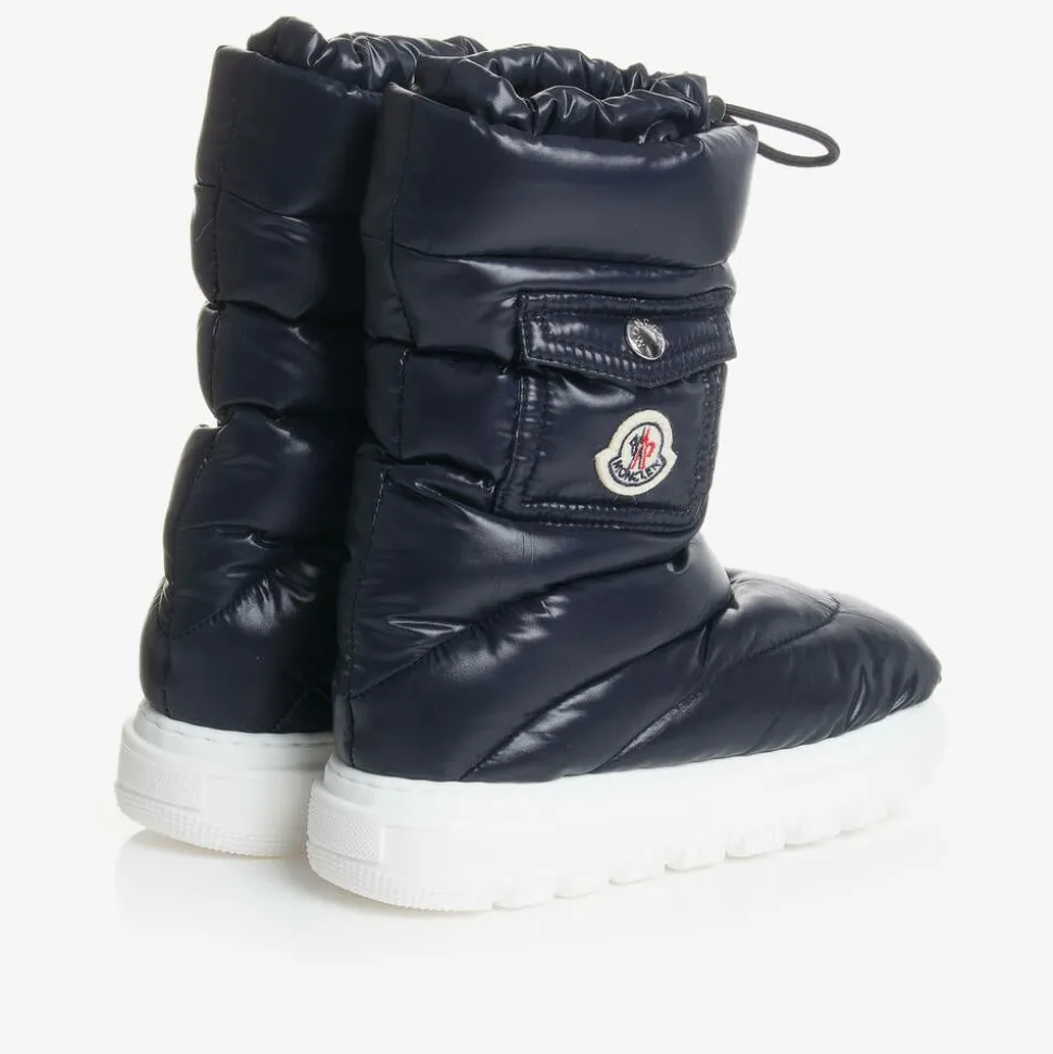 Navy blue technical boots for boys and girls by Moncler Enfant, made from silky nylon laqué with a warm down padding. The designer's signature logo badge is featured on the side pocket, which fastens securely with a popper. They are great for après ski wear, with an internal drawstring toggle to keep out the cold and snow. A soft leather insole and chunky non-slip rubber outsole create grip.