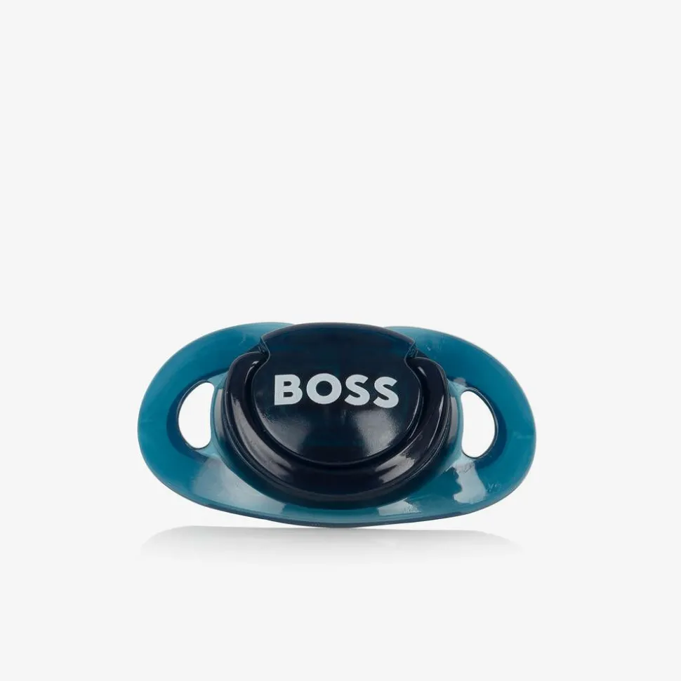 A navy blue BPA-free dummy for baby boys and girls by BOSS, with a distinctive white logo print on the front. This pacifier is made with a silicone teat in a comforting shape and a durable plastic shield. Helping to soothe your little one, the curved top fits easily under the nose and ventilation holes allow air to circulate.