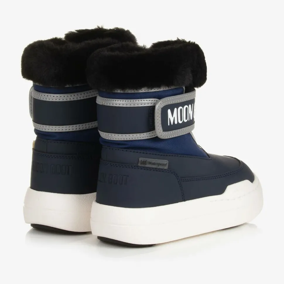 Cool navy blue ankle boots for boys and girls from Moon Boot, with faux fur trim and branded details. Offering a stylish city look combined with technical features for more challenging conditions, they are fully waterproof and have a bouncy EVA sole, textured for good grip. Padded and lined for warmth and comfort, they have an easy, velcro-fastening strap and reflective trim for improved visibility.