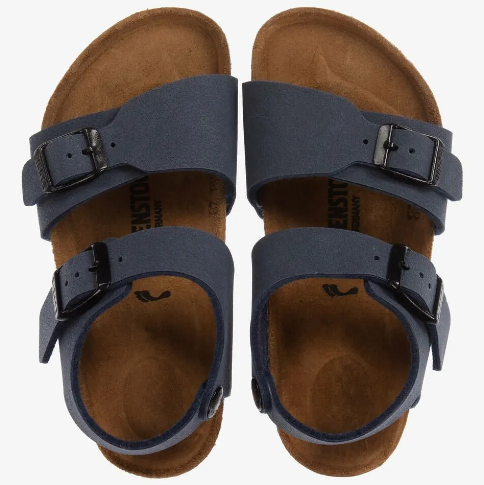 Navy blue Birkenstock sandals for boys and girls. The straps are made from soft and skin-friendly Birko-FlorĀ® faux leather with black buckle fastenings. The suede leather insole has an anatomically contoured footbed for promoting good walking posture, making them a great choice for growing feet. The black EVA rubber outsole improves grip.
