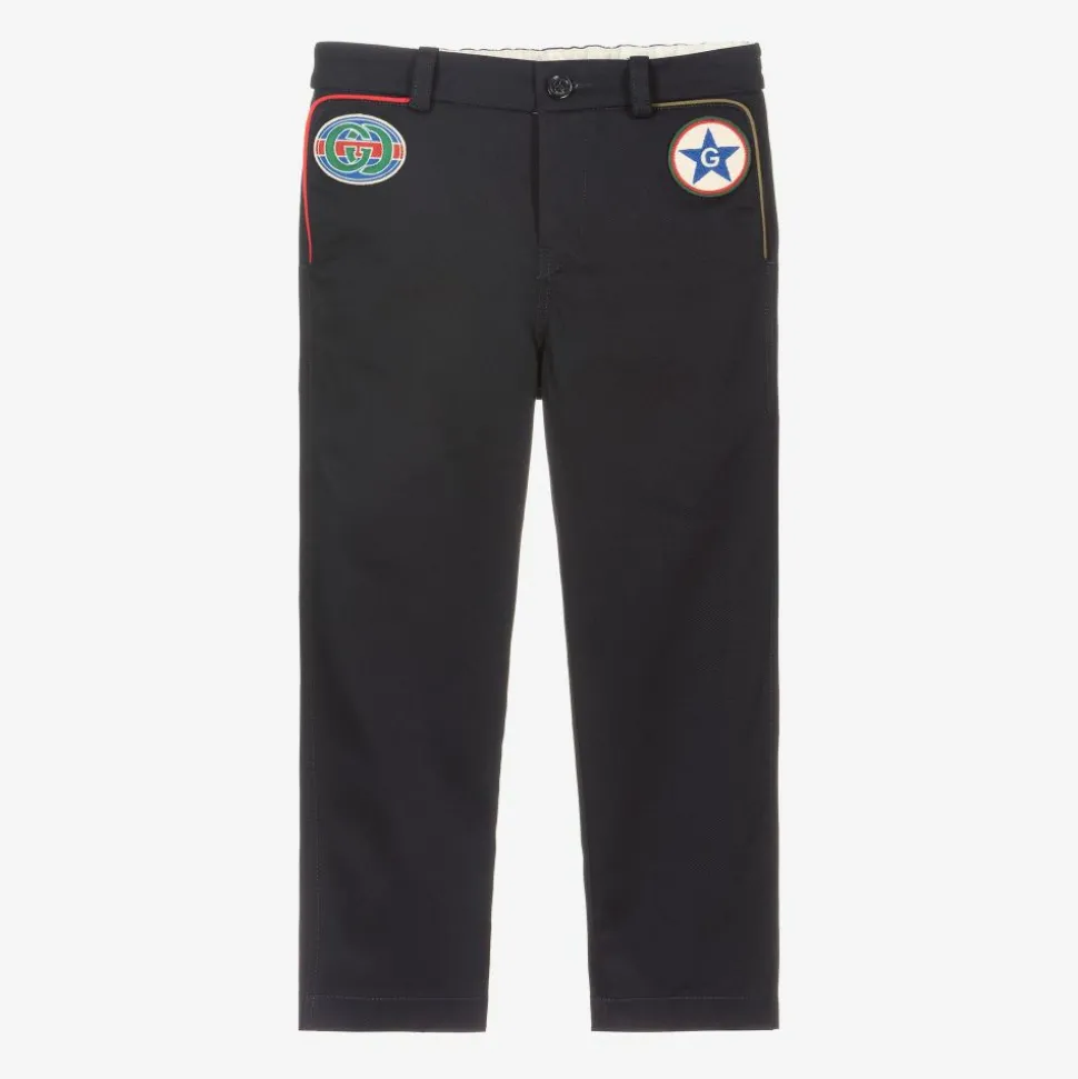 Navy blue trousers for boys from luxury Italian brand Gucci, made in mid-weight cotton gabardine with a slight stretch. Taking cues from the House Codes, there are two vintage inspired logo badges on the front, one of which is their classic Interlocking G. There are two front pockets trimmed in green and red, zip and button fastening, and an elasticated waist on the back.