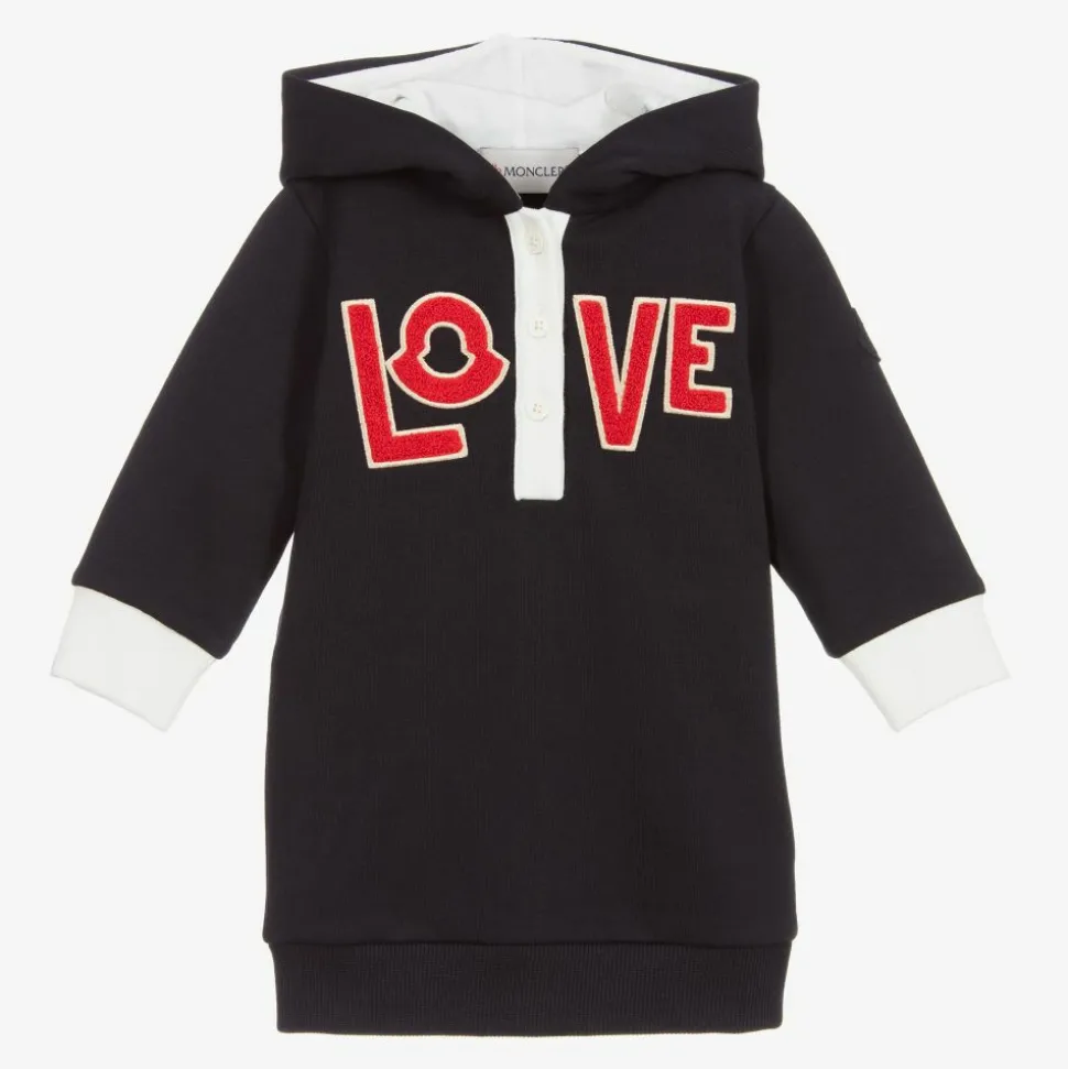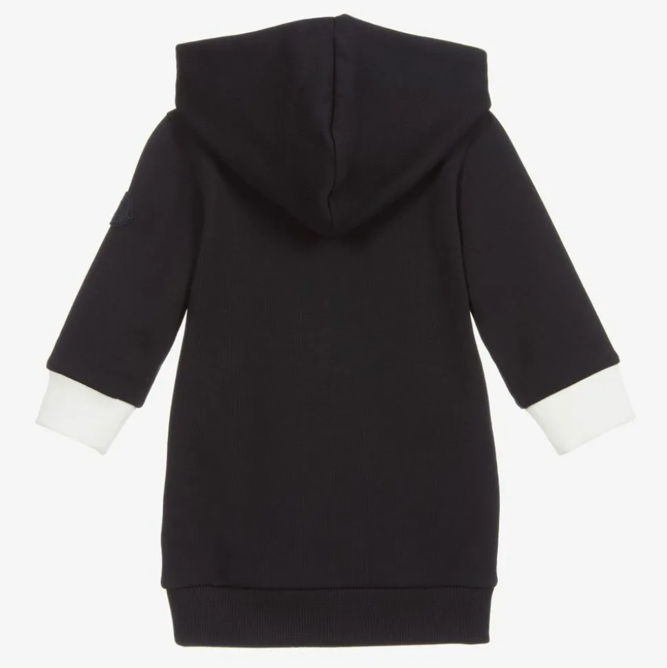 Navy blue hooded dress for little girls by luxury French brand Moncler Enfant, made in soft and stretchy cotton jersey. It has red towelling and beige appliqué detailing across the chest and front button fastening. It has contrasting white ribbed cuffs and a navy blue cuffed hemline.
