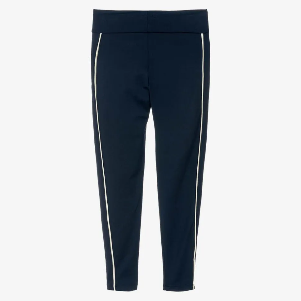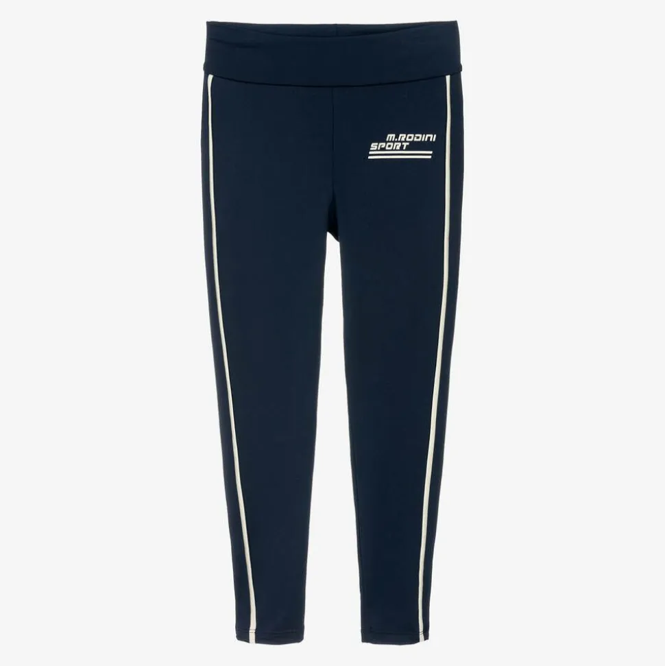 Navy blue sports leggings for boys and girls by Mini Rodini, made in silky smooth, stretchy jersey for easy movement. These full-length leggings have ivory trims on each leg and a sporty logo print on the leg for brand recognition. The stretchy waistband ensures a comfortable fit and feel on active days. This product contains recycled materials.