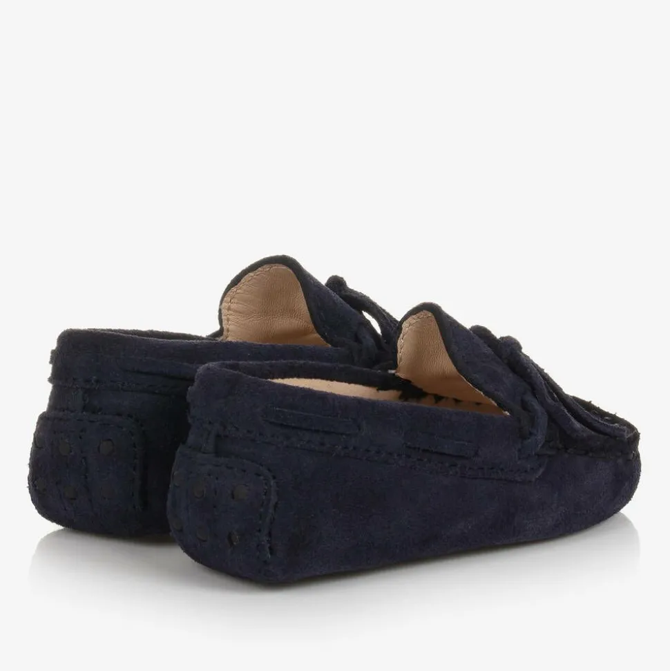 Navy blue pre-walker Gommino moccasins for baby boys and girls by luxury brand, Tod's. Expertly handmade in soft suede leather, this classic timeless style has a sweet bow on the rounded stitched toe, with pebble grips on the outer sole. The lining and insole are in smooth leather, providing stylish comfort for tiny little feet.