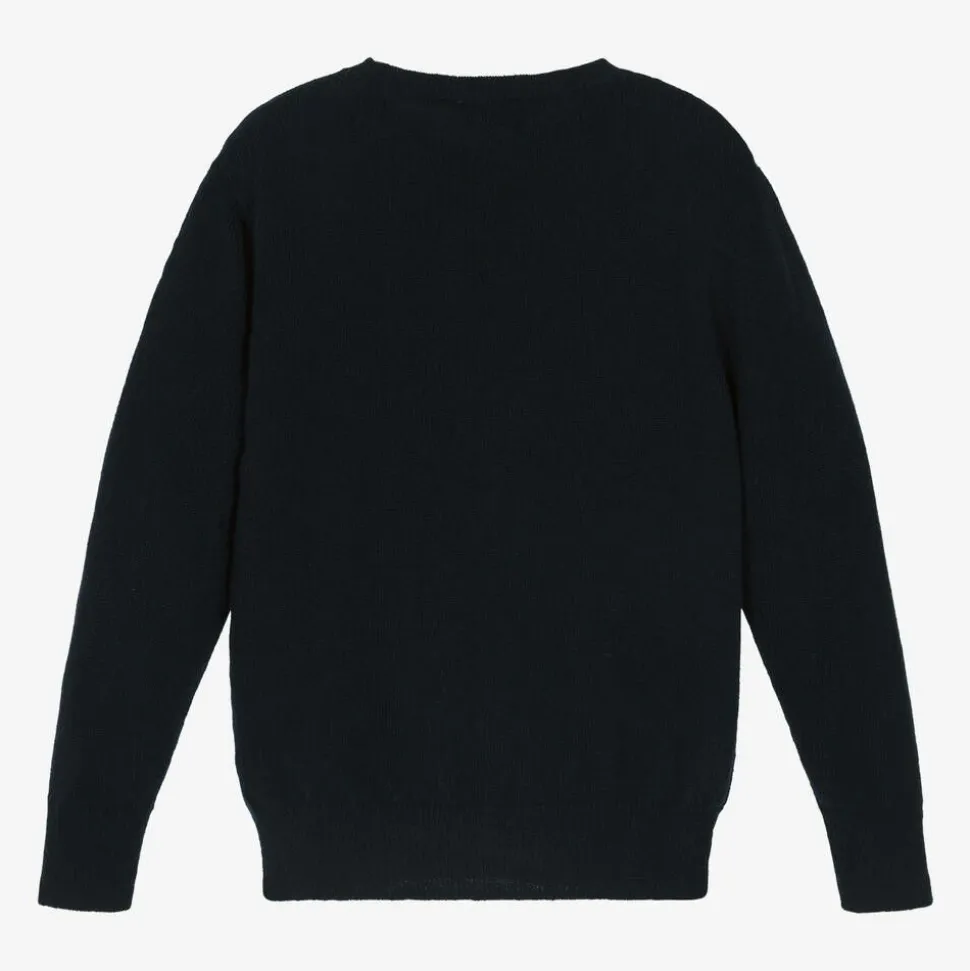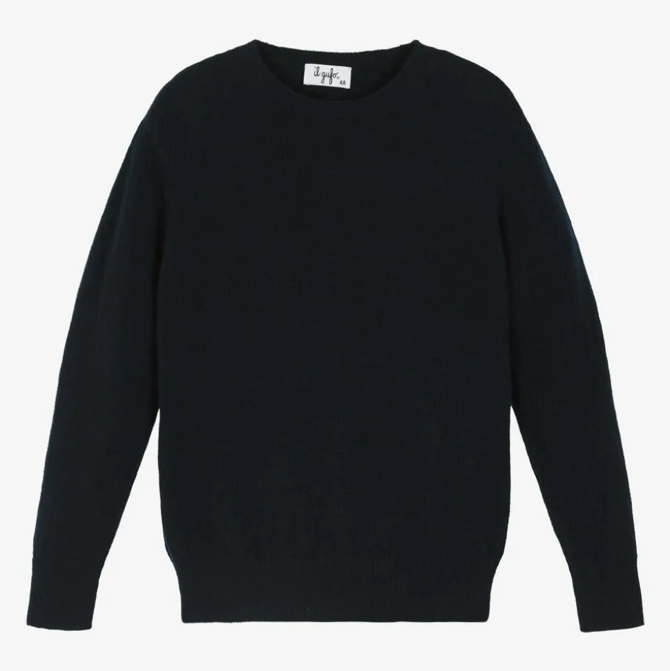 Navy blue sweater for boys and girls from luxury Italian brand Il Gufo, knitted in wonderfully soft virgin wool. Simply styled with a crew neckline and ribbed trims, this warm yet lightweight top is ideal for layering on cooler days.