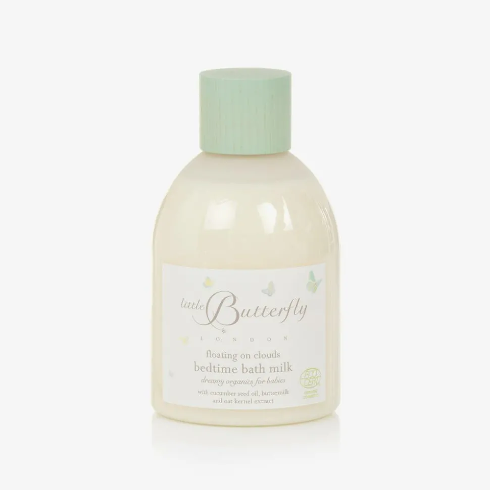 'Floating on Clouds' bath milk for younger boys and girls by Little Butterfly London, suitable for use from birth. Relaxing and nourishing, this certified organic bath milk is made with calming and comforting ingredients, gentle enough for very sensitive, dry and eczema-prone skin. It contains moisturising cucumber seed oil, nourishing oat kernel extract and buttermilk. Hypoallergenic and dermatologist approved, this UK-made bath product creates a calming, subtly fragranced aroma when poured under warm water, thanks to orange and mandarin essential oils. Avocado and papaya seed oils help to soothe dry, itchy skin.