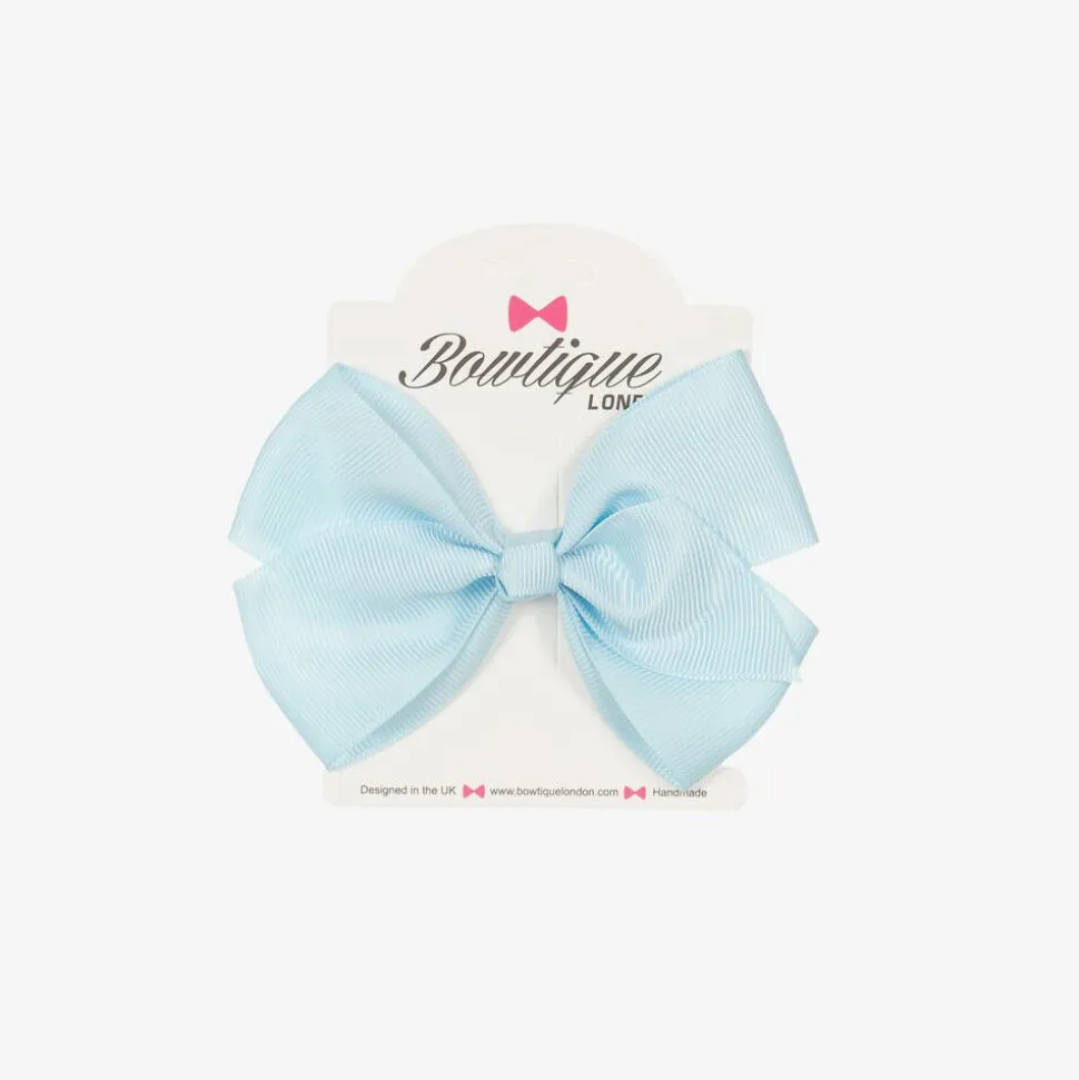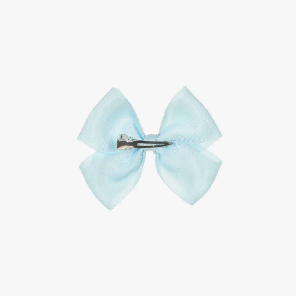 A pale blue hair clip for girls by Bowtique London, lovely to accessorise an outfit. The bow is handmade in delicate grosgrain ribbon and set on a slide-in metal clip.