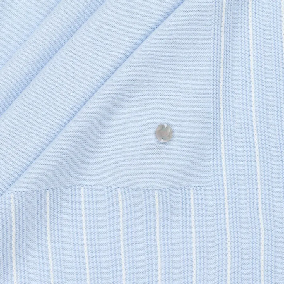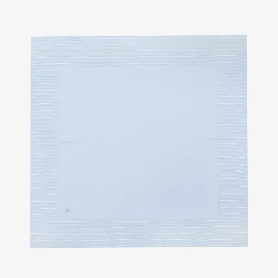 Pale blue blanket for baby boys and girls by Spanish brand Artesania Granlei, with a deep border striped in white. Made in a soft, lightweight knit, it has an iridescent mother-of-pearl logo charm sewn in one corner. The blanket is ideal for use in the nursery, or for when out and about in the pram or car seat.