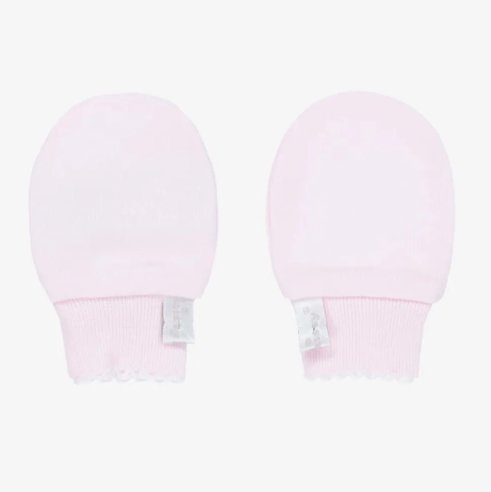 A pair of pale pink scratch mittens for baby girls, by Kissy Kissy. Soft and stretchy, they are made in comfortable Pima cotton jersey, ideal for delicate skin. They have white picot trim and ribbed cuffs, so they stay securely on little hands.