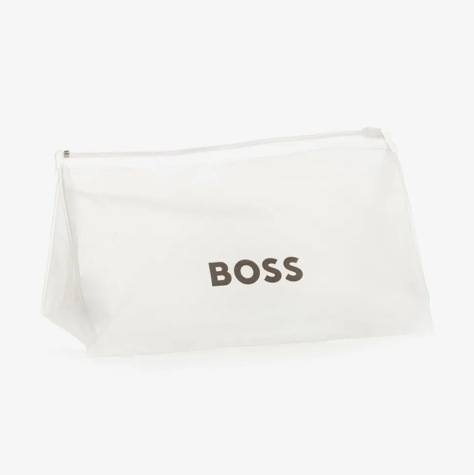 Adorable pale pink and white bunny soft toy for baby girls by BOSS. Super soft and plush, this cuddly little friend has a sweet embroidered face feature and a logo on each foot. Presented in a branded pouch, it makes a lovely gift for little ones as well as a cute decoration for the nursery.
