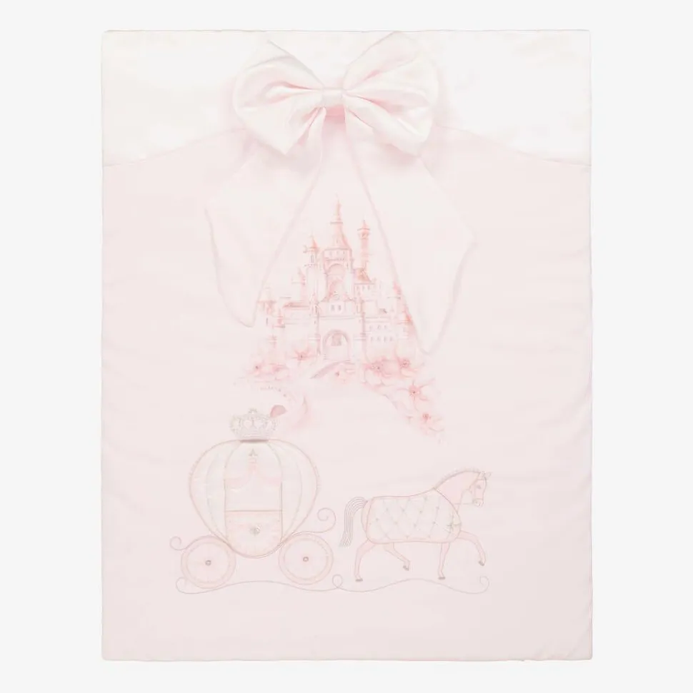 Pink padded blanket for baby girls by Sofija, made in soft cotton jersey. An attractive nursery accessory, it has a beautiful princess castle and flower illustration in pink on the front, together with a satin horse and carriage appliqué, embellished with sparkly diamantés and metallic silver embroidery. It has a silky satin trim at the top, with a gorgeous oversized satin bow to finish.