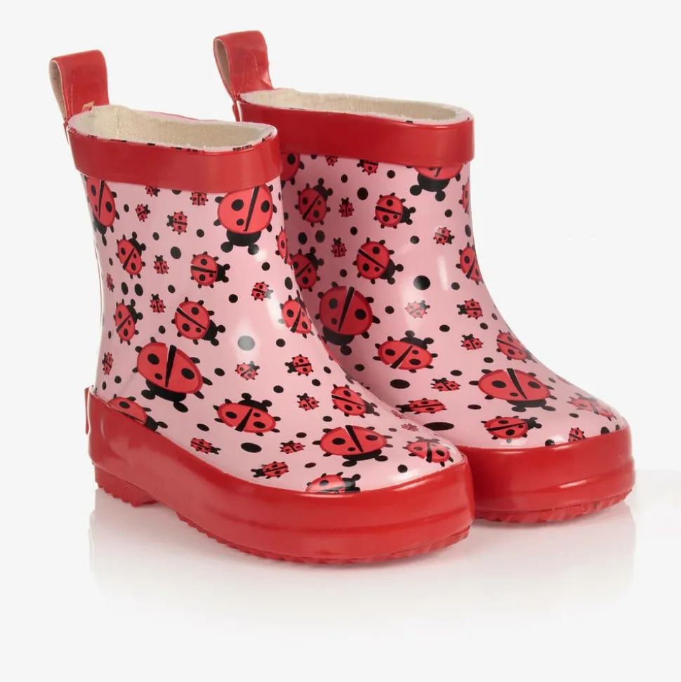 Pink rain boots for little girls by Playshoes, made from flexible rubber with a cute red ladybird print. Lined in soft textile, they have a padded inner sole for comfort, and a silver reflective patch on the back for safety during evening walks.