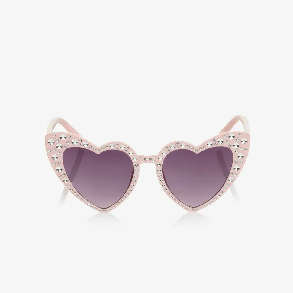 Super cute pink heart-shaped sunglasses for girls by Angel's Face, with diamanté decoration. They have tinted lenses and are finished with a gold logo print on the arms. They come in a luxurious pink case, complete with a soft cleaning cloth.