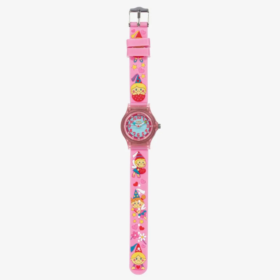Pink analogue watch for younger girls by Baby Watch, Paris. A comfortable design, the flexible rubber straps are decorated with pretty princess fairies, hearts and flowers. Ideal as a first watch, it has a visible light blue dial and an adjustable, nickel-free pin and buckle clasp. It includes an educational wall chart featuring a clock face with moveable hands and a season clock to learn about time, weather and months.