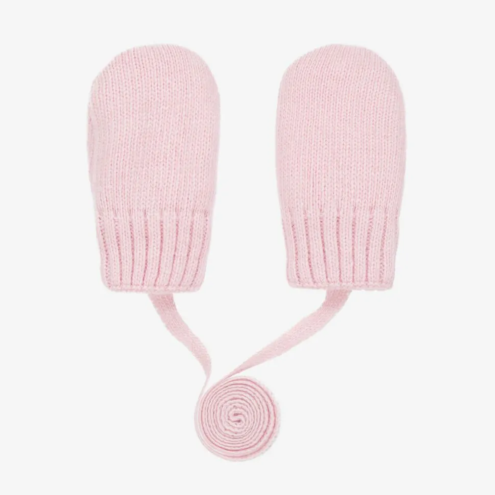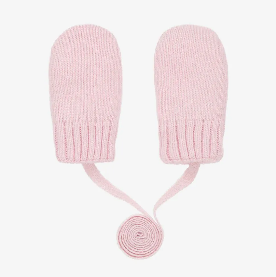 A pair of pale pink mittens for baby girls by Jamiks. Soft and cosy for tiny hands, these mittens are lined with cotton fleece and luxuriously knitted in a wool and cashmere blend. The attached strap threads through the sleeves of their coat or jacket to ensure the mittens do not get lost.