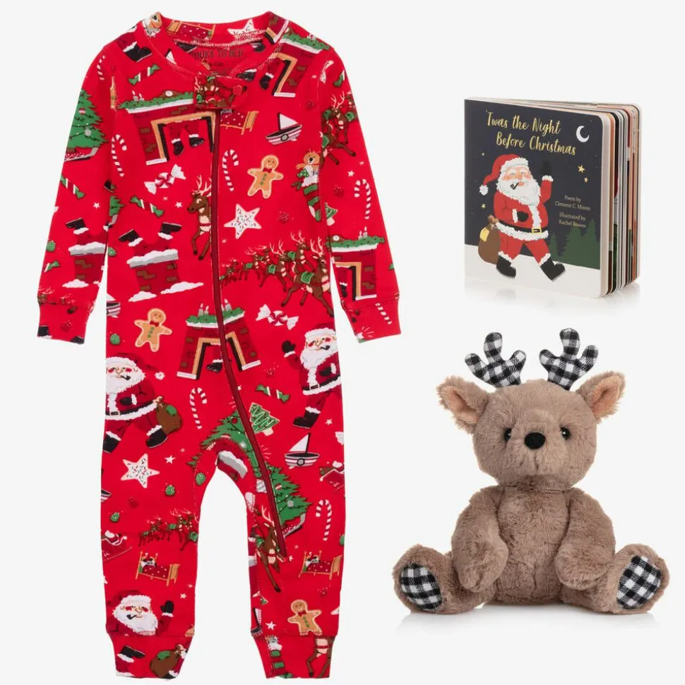 An delightful gift for baby boys and girls, this Christmas Eve box is by Childrensalon Hampers. The red cotton Hatley romper has an adorable festive pattern, inspired by the included cardboard book of 'Twas the Night Before Christmas'. A cuddly, handmade beige reindeer soft toy with black and white gingham check antlers by Aurora complete this adorable set for a joyful bedtime experience.