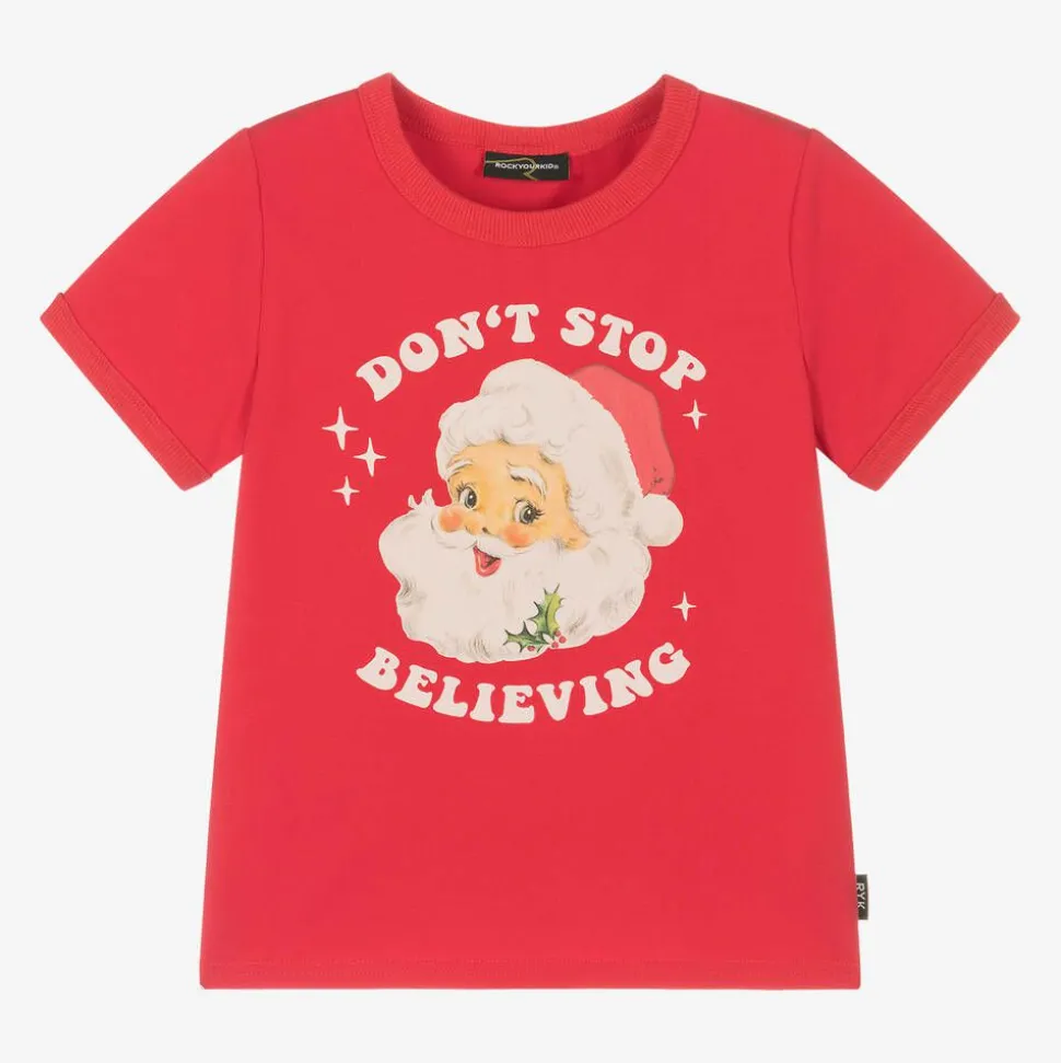 A festive red T-shirt for boys and girls by Rock Your Baby, featuring a fun Santa face and the words, 'Don't Stop Believing'. It is made in soft cotton jersey with short sleeves and ribbed trims.