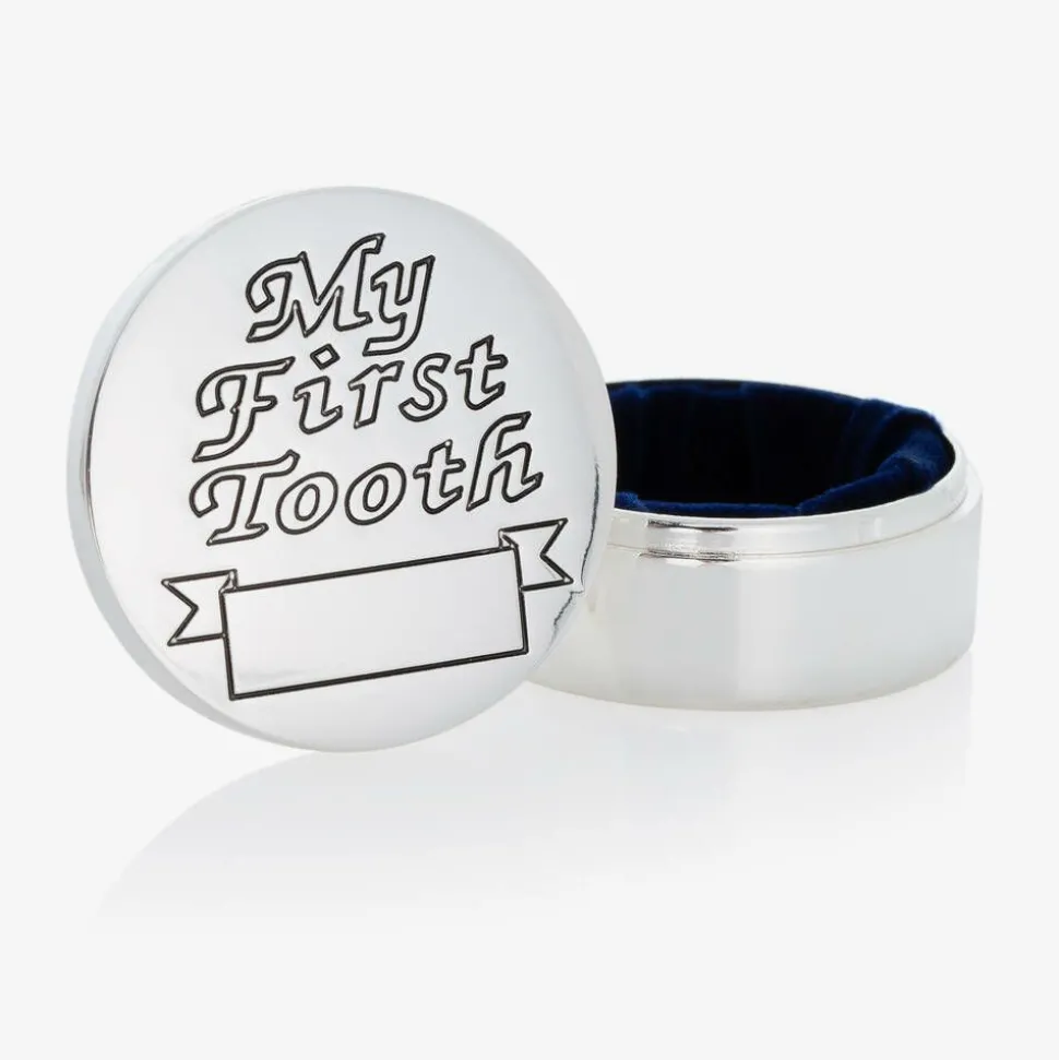 A charming set of two silver-plated keepsake boxes for baby boys and girls from English Trousseau. These sweet boxes are embossed with "my first curl", "my first tooth" and small banners for engraving with the date. A thoughtful gift, the two boxes come with a sweet fabric storage pouch and a gift box.