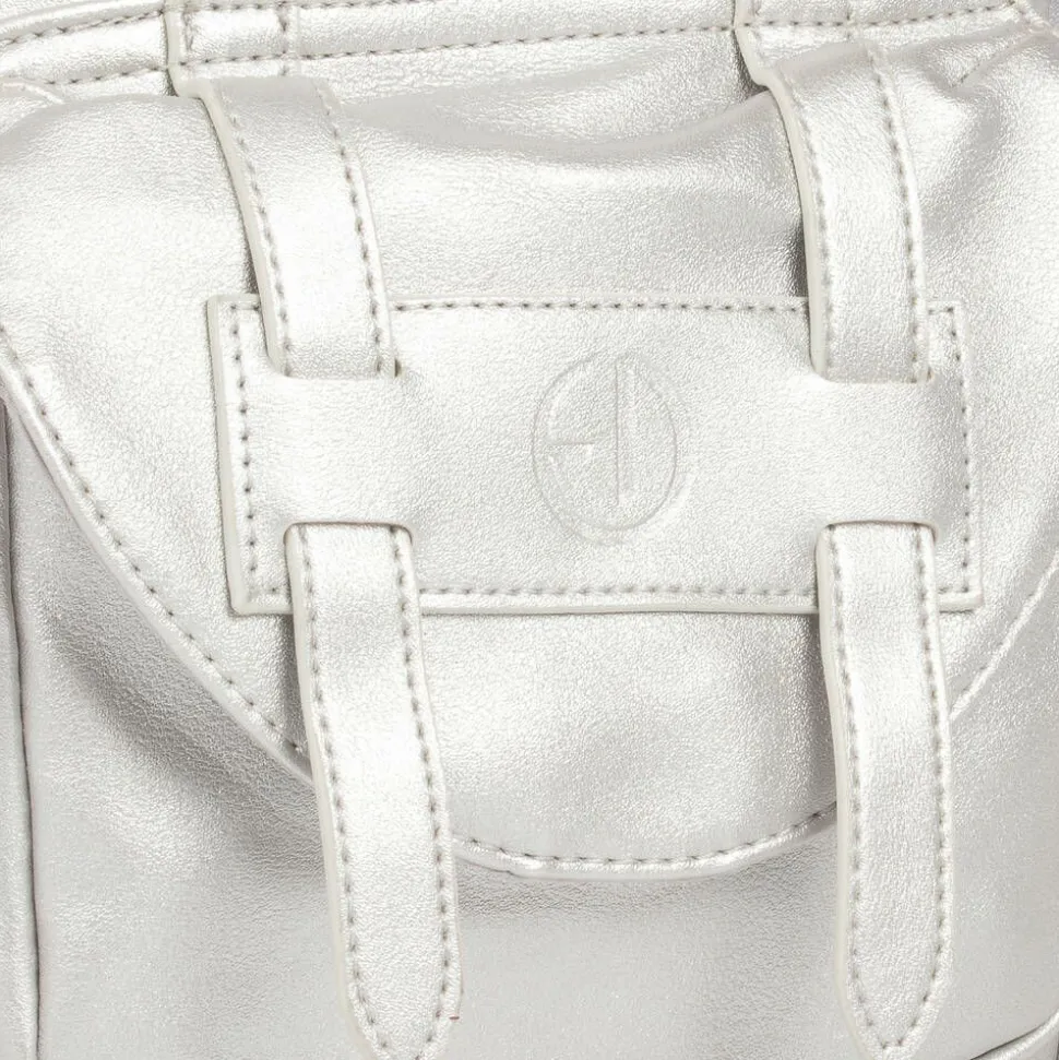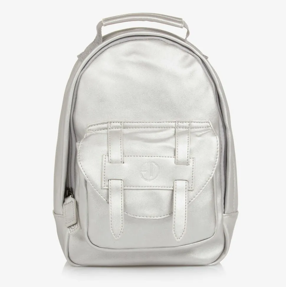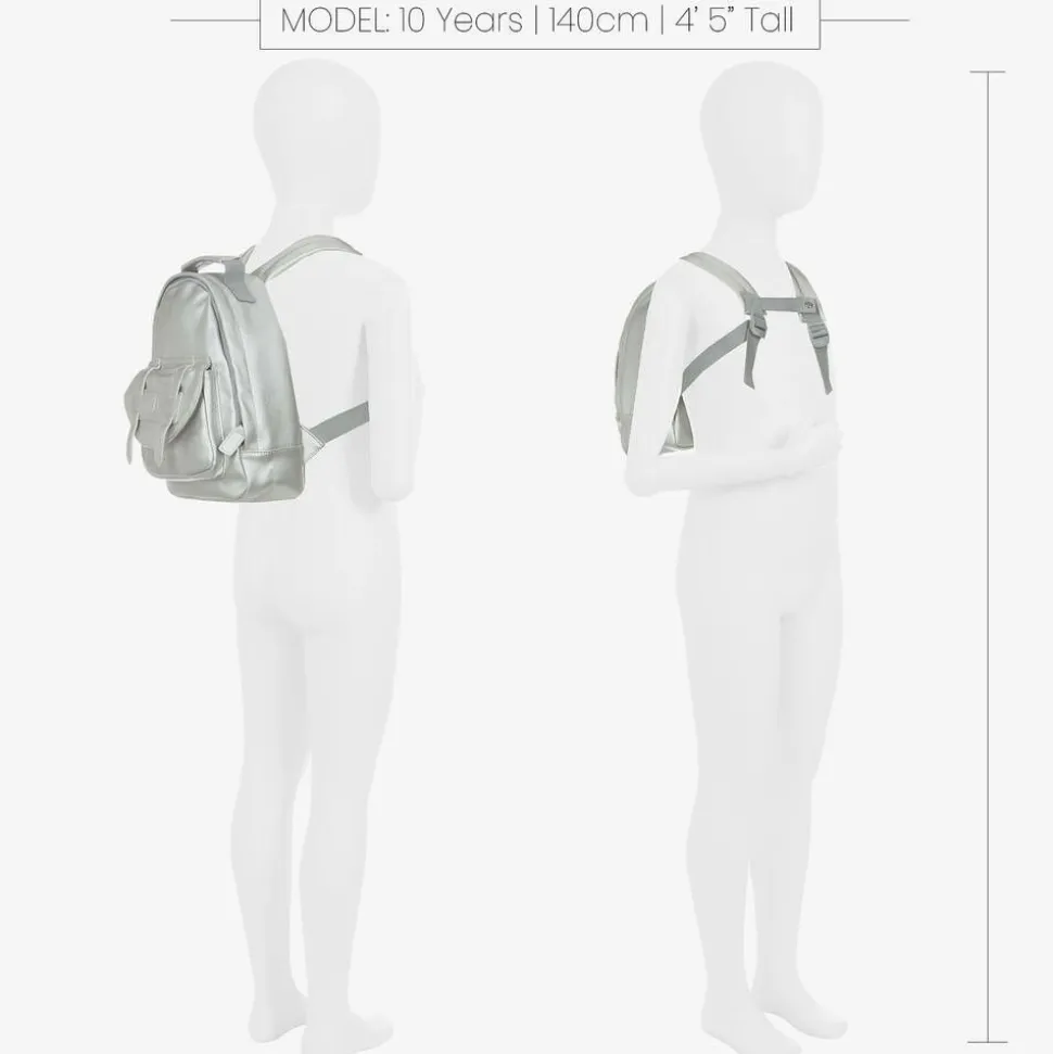 In metallic silver, this faux leather mini backpack for little boys and girls is by Elodie. Great for outings or school, the zip-fastening main compartment includes a name badge, a thermal bottle pouch and a removable padded insert. There is a useful carry handle and the adjustable padded shoulder straps secure with magnetic chest strap. Adding a designer touch, the external front pocket is covered by a branded flap, fastening with a magnetic popper.